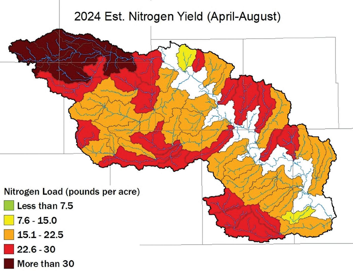 Figure 2. Map of the Middle Cedar Watershed showing relative nitrogen loading (pounds per acre) estimated for each tributary (HUC-12 subwatershed). The areas shown as white represent the mainstem of the Cedar River and were not sampled. (Map courtesy of Iowa Soybean Association)