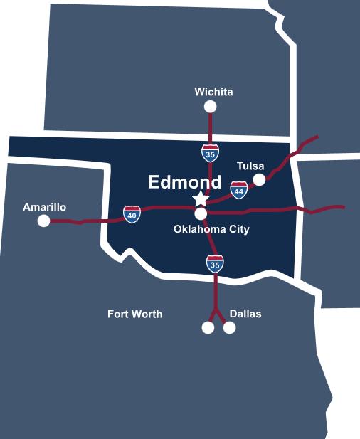 Edmond is located just 13 miles north of Oklahoma City (OKC), the capital of Oklahoma.