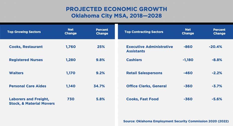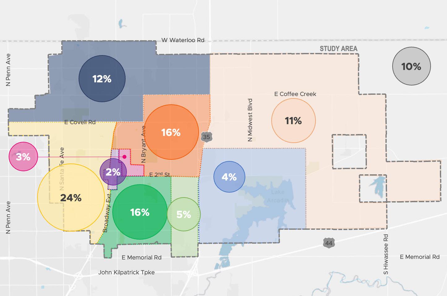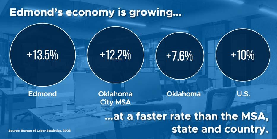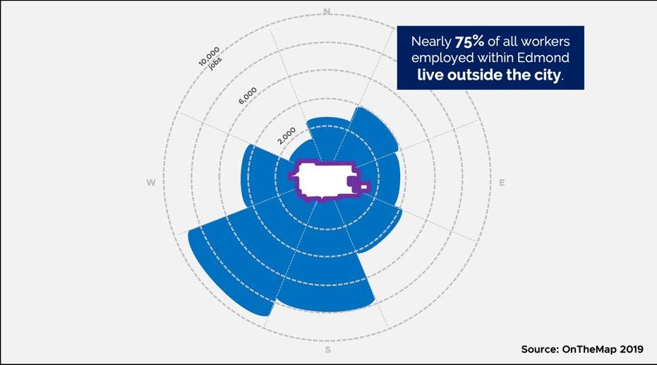 Edmond is a major contributor to the Oklahoma City Metropolitan Statistical Area (MSA) economy with eight percent of the county’s total jobs and 14 percent of the county’s retail supply. The economy in Edmond is growing at a faster rate than the Oklahoma City MSA, the state of Oklahoma, and the United States. This job growth is expected to continue, and appropriate housing development at price points workers can afford will be critical to ensure that employees are able to both live and work in Edmond. Currently, nearly 75 percent of all workers employed in Edmond live outside the city, and long commute times combined with limited regional transit are both contributing to traffic congestion and making it harder for local employers to fill open positions.