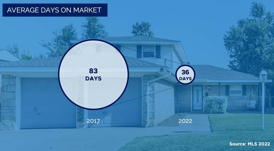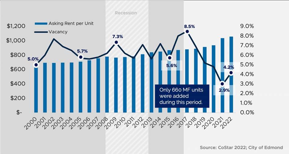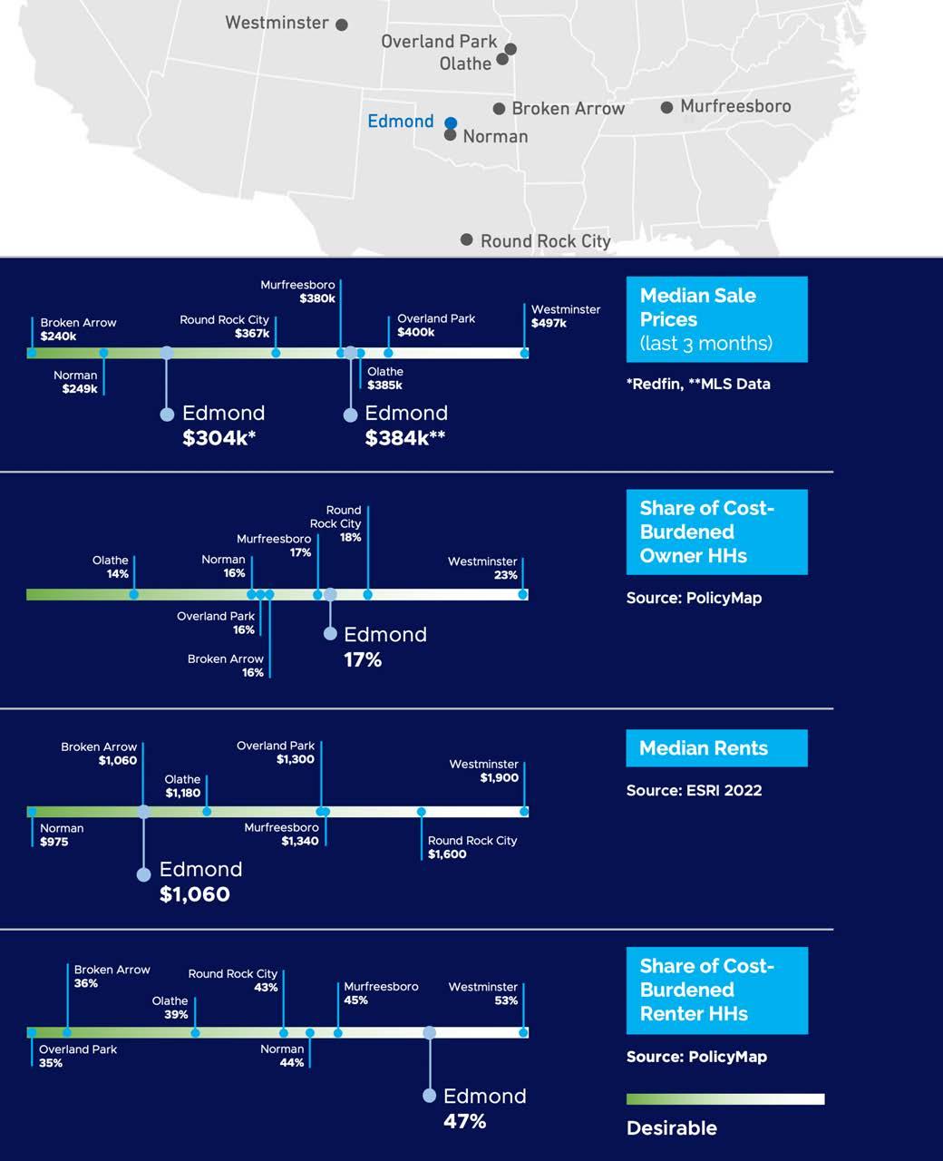 Between 2017 and 2022 in Edmond, new home prices increased by 31 percent, the median home value increased by 38 percent, and the average number of days a home was on the market decreased from 83 to 36. The rental housing market is also very competitive: only 660 multifamily homes were built in Edmond in the last five years, and most of those homes are agerestricted for people aged 55 and older. Dedicated affordable housing is limited across Edmond. Currently, there are 7,425 households that qualify for affordable housing, but only 1,790 to 2,250 dedicated affordable units are available to serve them.