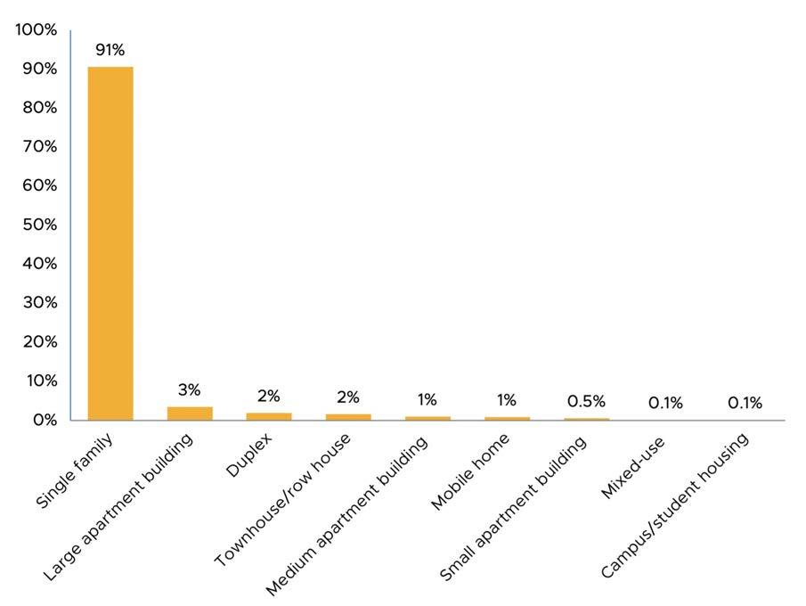 The least popular housing preferences were lowrise multifamily apartments off the highway (1.6 percent), low-rise multifamily apartments in a suburban area (2 percent), single-family detached housing on a small urban infill lot (3 percent), and low-rise multifamily apartments within an urban neighborhood (3 percent).
