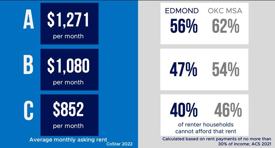 Nearly one-third of all households in Edmond are housing cost burdened, including 17 percent of homeowners and 47 percent of renters. Rent for a safe and decent two-bedroom home in Edmond costs around $1,020, including utilities, which 40 percent of renters in the city cannot afford. There is also a disconnect between the housing that is available in the city and what Edmond residents can generally afford: the average sale price for a new home in Edmond is about $429,000, and 64