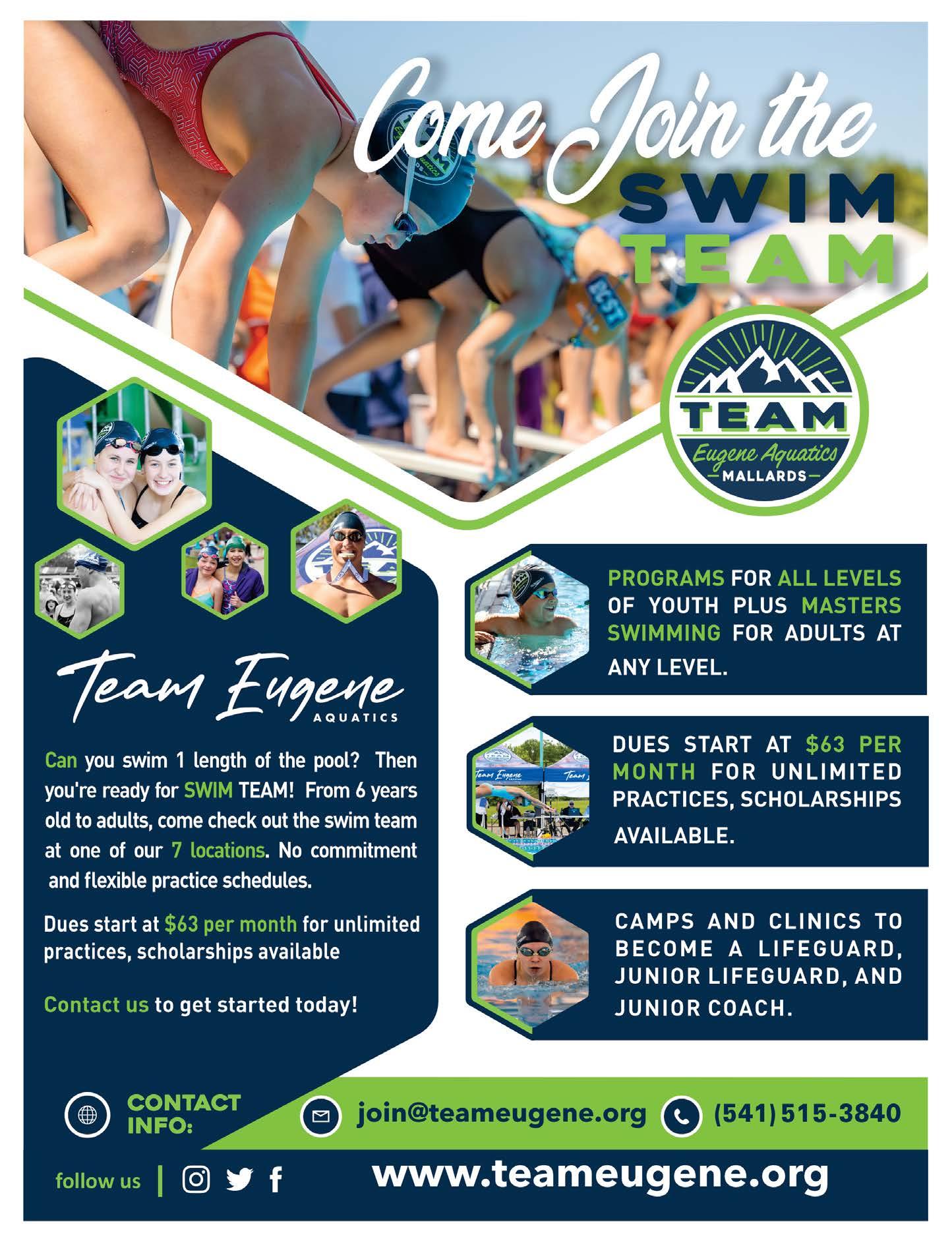 Política de pañales para nadar: Todaslasinstalaciones denatacióndelaciudaddeEugenerequierenpañales denataciónconelásticosalrededordelaspiernasyla cinturaparaaquellosquenosabenusarelbaño.