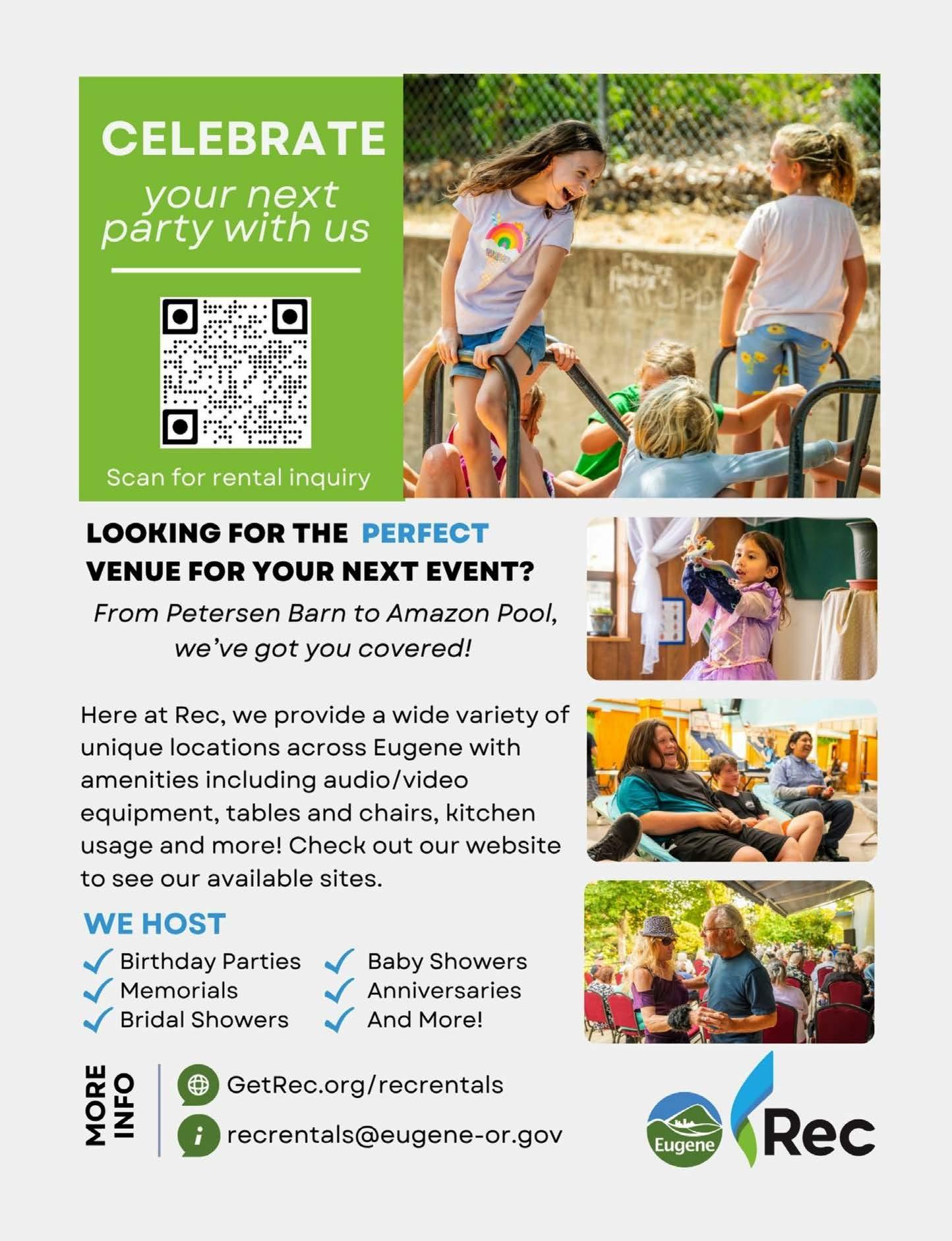 EugeneRecstaffiscommittedtomakingallreasonable effortstoensurethatitsfacilities,programsandservicesare accessibletoandusablebyallpeople.Individualswith disabilitiesarewelcometoparticipateinanyCityofEugene Recreationprogramwithintheeligibilityrequirementsof age,prerequisites,etc.
