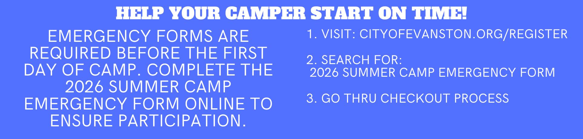 Emergency Contact Form: Participants in City of Evanston camp programs are required to have an information/emergency form on file prior to the first day of camp. Campers will not be allowed to participate in camp until their health form is submitted.