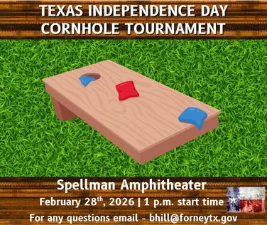 The Parks and Recreation Department is planning its first Cornhole Tournament of 2026 in conjunction with the Texas Independence Day Music Concert on Saturday, February 28 at 1:00 p.m. at the Spellman Amphitheater. The tournament will feature 45-minute matches, with each two-player team guaranteed three games, including two pool games and one bracket game. There is no registration fee, and boards and bags will be provided for participants.