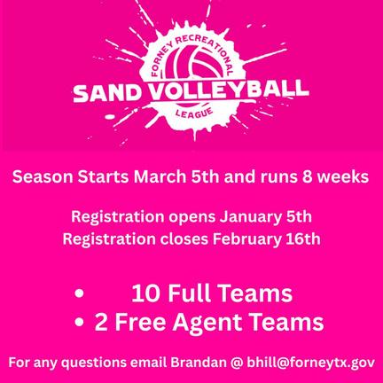 The Parks and Recreation Department is currently preparing for the upcoming Adult Spring Sand Volleyball season. Registration has now closed, and staff are finalizing league details and team coordination. Additional information regarding schedules and league play will be shared with participants soon.