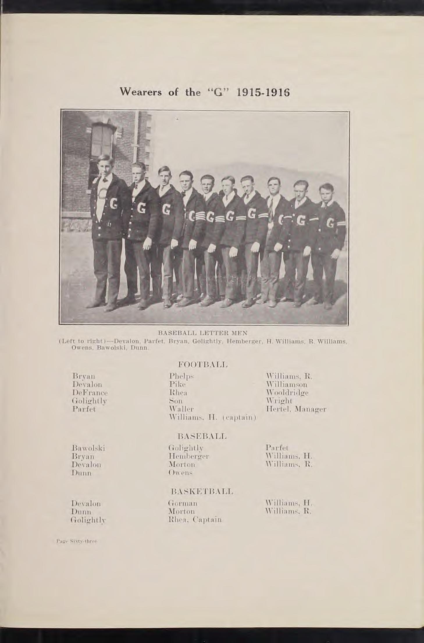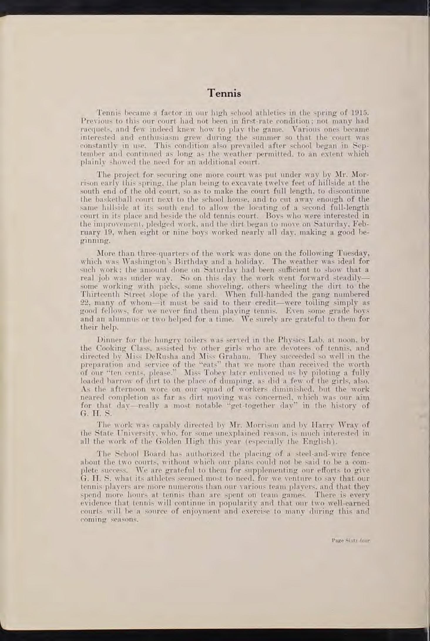 Too un11·h l I edit < Rn not I e gl\ en 01, ille Dennis for his c·easeless efforts in he half of the 1915 football team. His efficient roachin~. especially of the line, was a great benefit to all n1embers of the squad, anrl proved to be of imn1ense value in the gan1es against hea,·ier and n1ore experienced players. His ass i stance ,vas entirely w·ithout rec ou1pense, being given purel) out of interest in the school and the tean1 "Denny's " ' nan1e ancl effective work will always be remen1bered whenever tbe G H S. football team of 1915 is spoken of