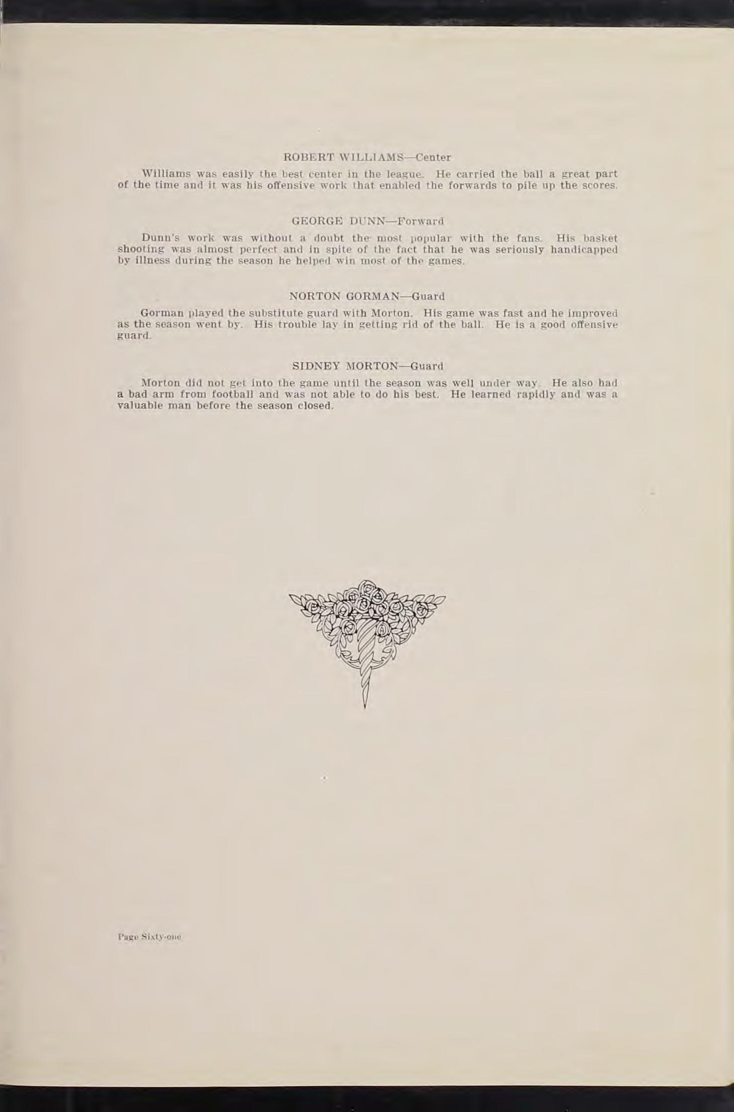 Bt·) an \\as hauclhappecl eu1l} iu the st>ason hy a hroken nos <> and really IH'\l 'l' hail 111\H h oppo1 tu1111y of finding hin1self. He is rntht>1 light fo1 a plnu~ing gan1e al fullback , hut he nu1<1e up for that by I e ing a to\\er of i.,trength on the defense He playP 1l his best gan1e again~t the D t• Fre!"hlltf'n Dick "ill not lie \\ ith 1 s tH•\.t , c,·11 as he lea, es for · othf'r "oriels to co 1H111er."