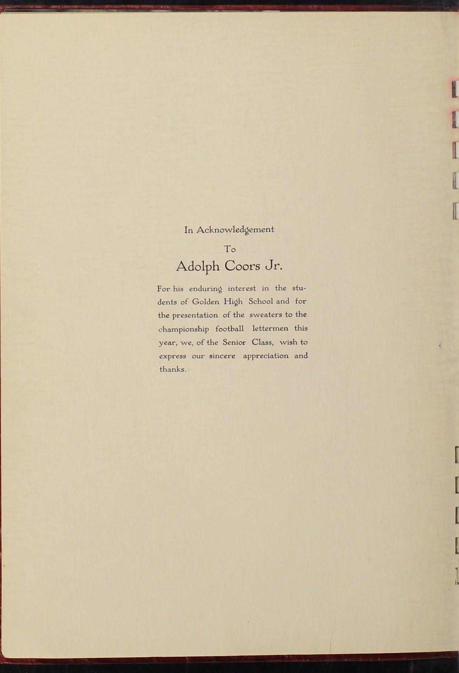 For his endurin~ interest in the students of Golden H i~h School and for the presentation of the sweaters to t he c hampionship foot b a ll l etterme n this year, we, of the Senior Class, wis h to express our sincere appreciation and thanks.