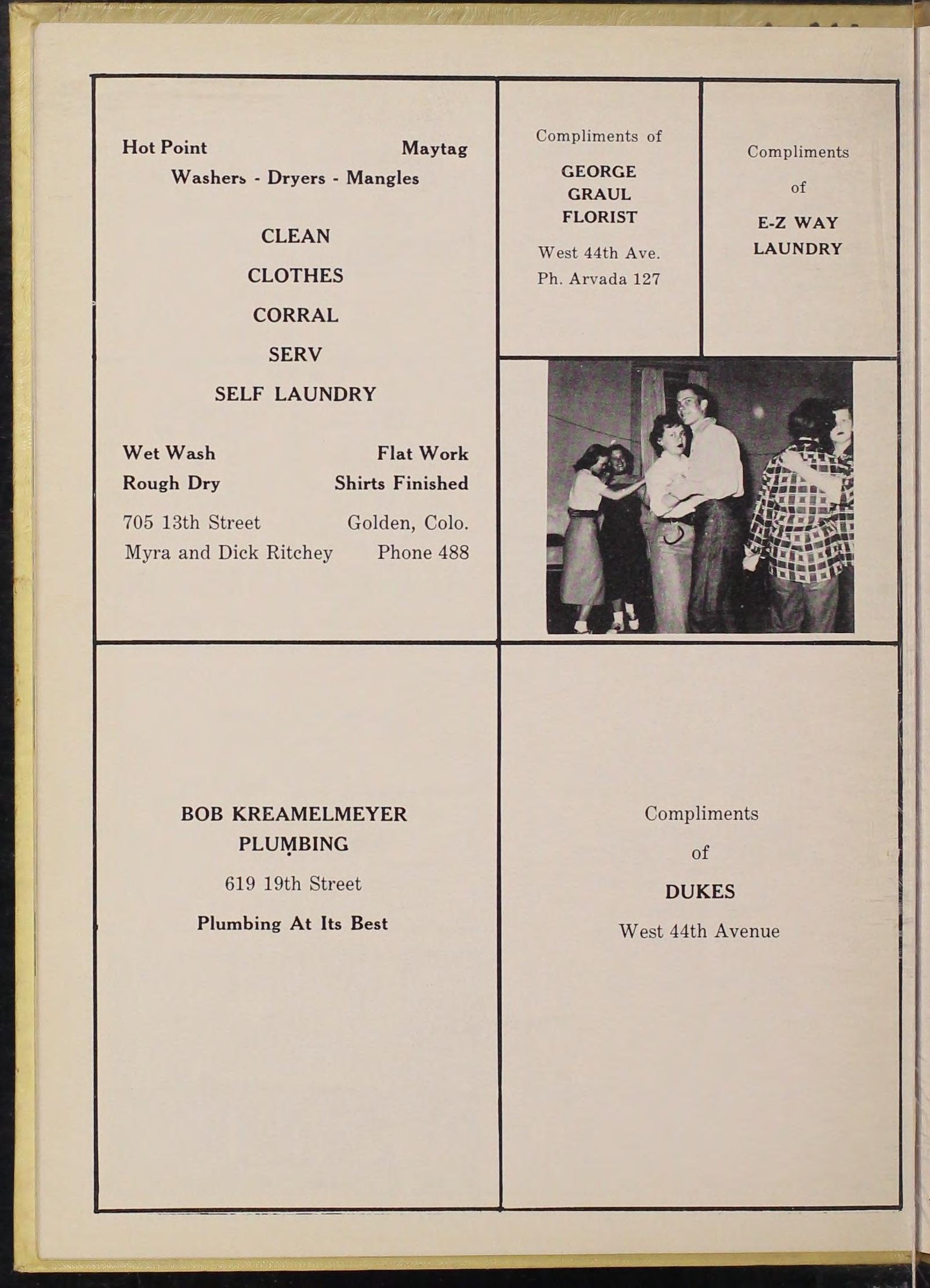 Hot Point Maytag Washer~ - Dryers - Mangles CLEAN CLOTHES CORRAL SERV SELF LAUNDRY Wet Wash Flat Work Rough Dry Shirts Finished 705 13th Street Golden, Colo. Myra and Dick Ritchey Phone 488 BOB KREAMELMEYER PLUMBING • 619 19th Street Plumbing At Its Best Compliments of GEORGE GRAUL FLORIST We s t 44th Ave. Ph . Arvada 127 Compliments of E-Z WAY LAUNDRY Compliments of DUKES West 44th Avenue