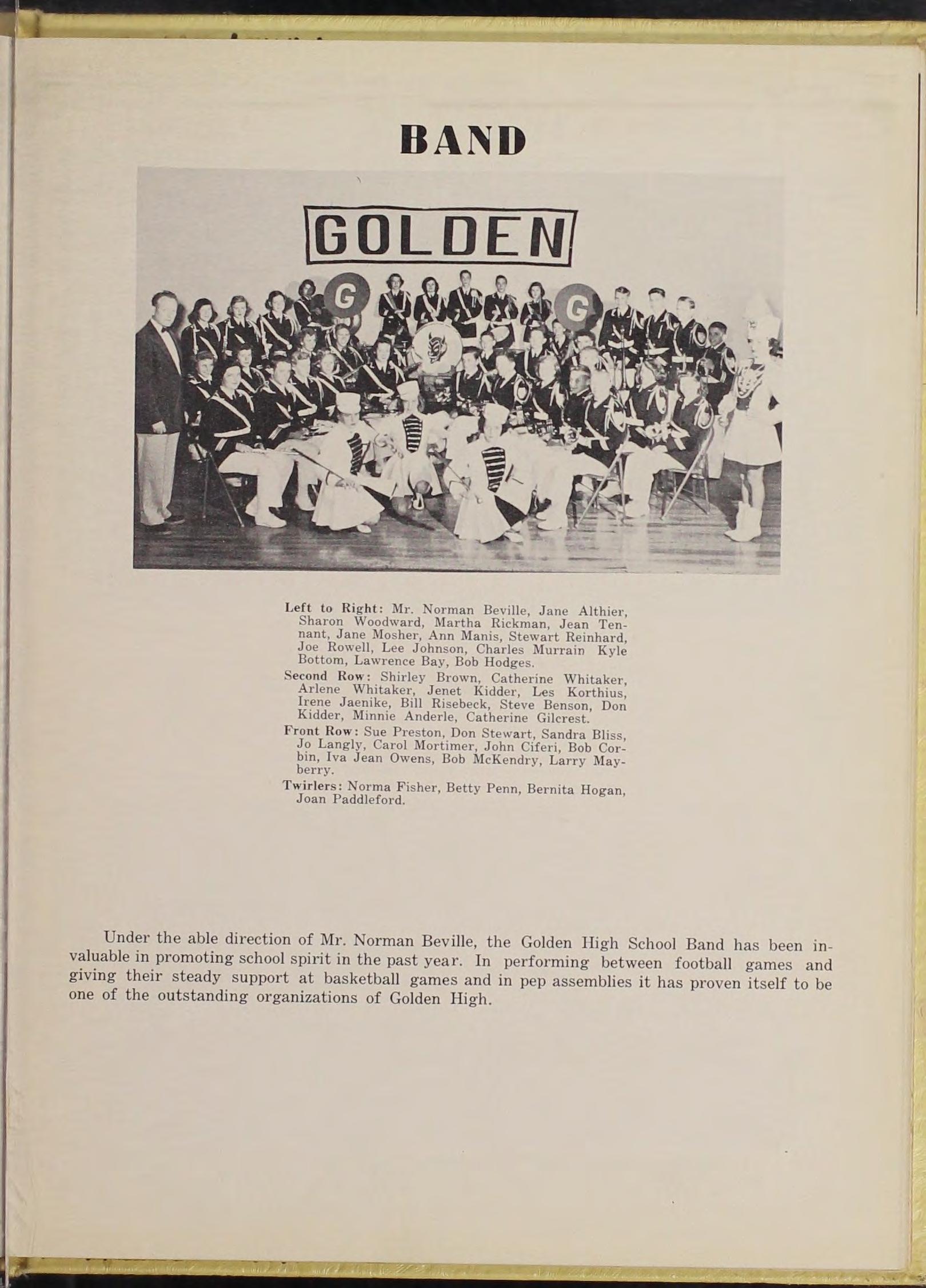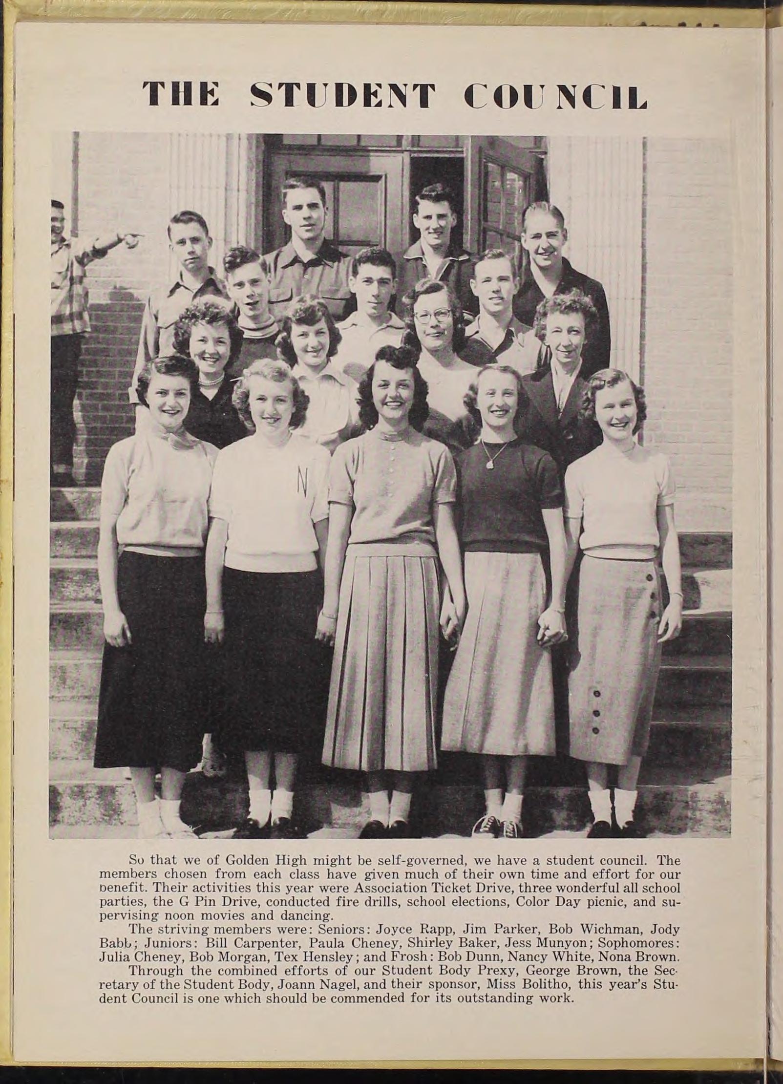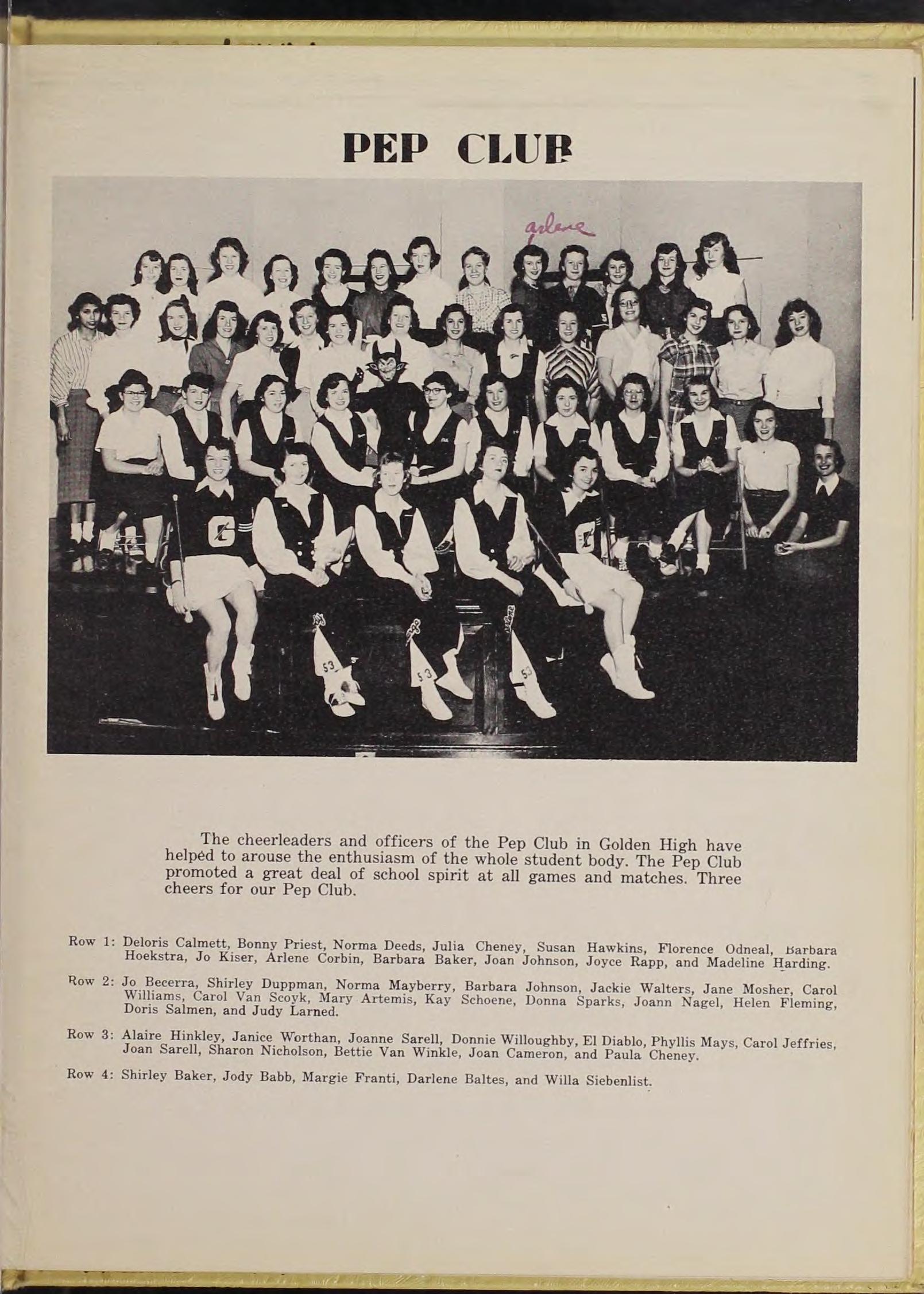 The cheerleaders and officers of the Pep Club in Golden High have helped to arouse the enthusiasm of the whole student body. The Pep Club promoted a great deal of school spirit at all games and matches. Three cheers for our Pep Club.