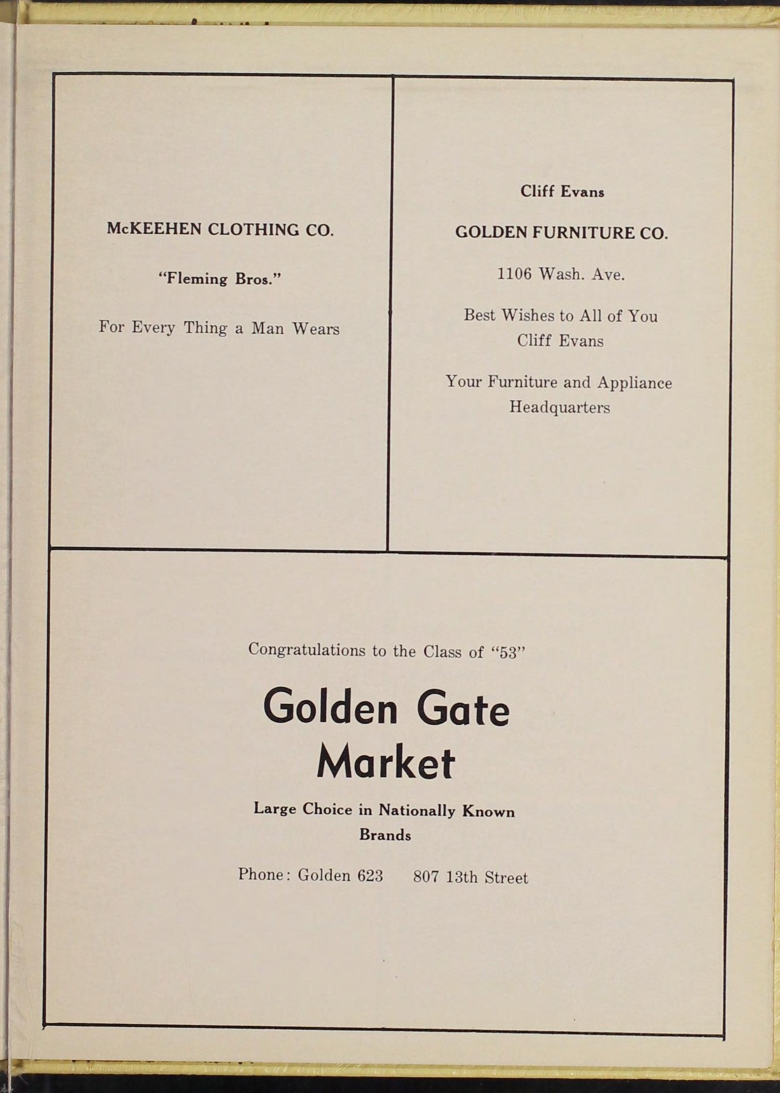 McKEEHEN CLOTHING CO. '' Fleming Bros." For Every Thing a Man Wears Cliff Evans GOLDEN FURNITURE CO. 1106 Wash. Ave. Best Wishes to All of You Cliff Evans Your Furniture and Appliance Headquarters Congratulations to the Class of ''53" Golden Gate Market Large Choice in Nationally Known Brands Phone: Golden 623 807 13th Street • •