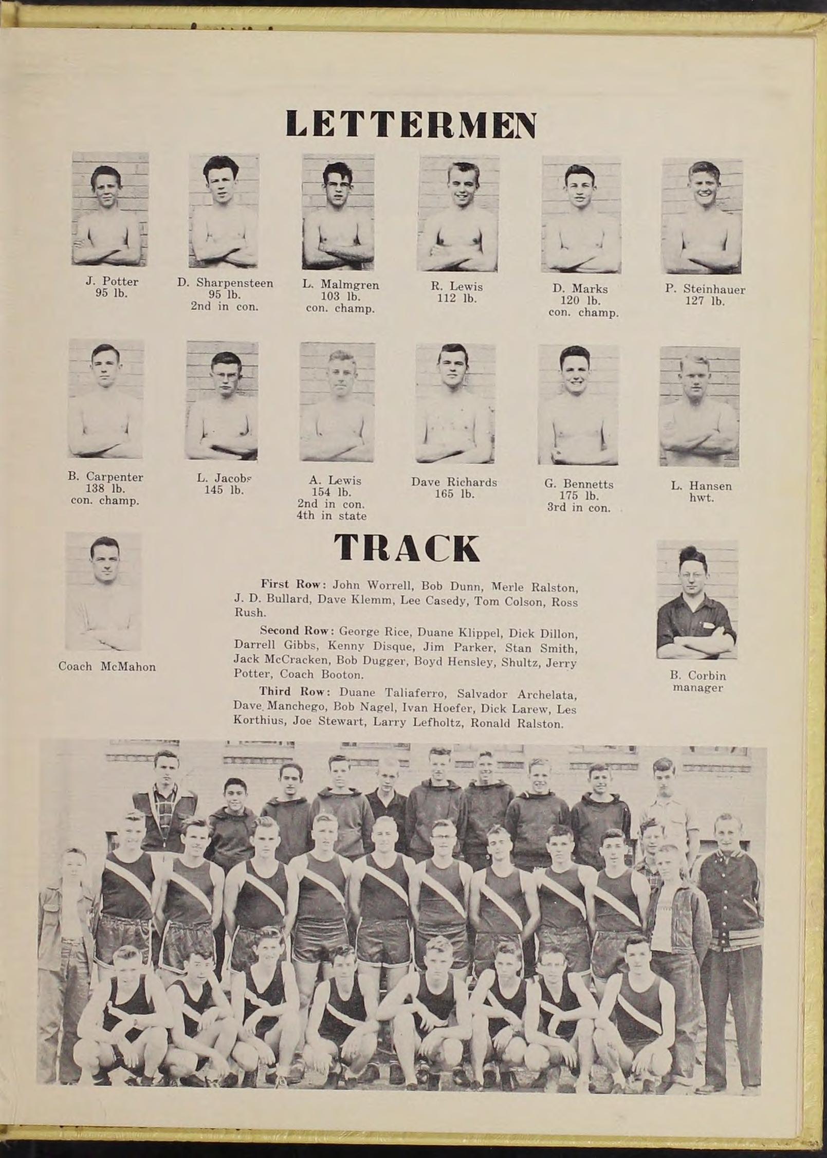 J. Potter 95 lb. •Cl. •-J B. Carpenter 138 lb . con. champ. Coac h l\Icl\1ah o n-D. Sharpensteen 95 lb. 2nd in con.LETTERMEN L Malmgren 103 lb. con. c hamp. - it_ t :tC R L e,vis 112 lb • .. D. M arks 120 lb. con. champ r--- • 1tl_ L Ja cob~ 145 lb. .,.L ' A. Lewis 154 lb. 2nd in co n 4 th 1n state Dave Richard s 165 lb. TRACK l G. Bennetts 175 lb. 3rd 1n con.