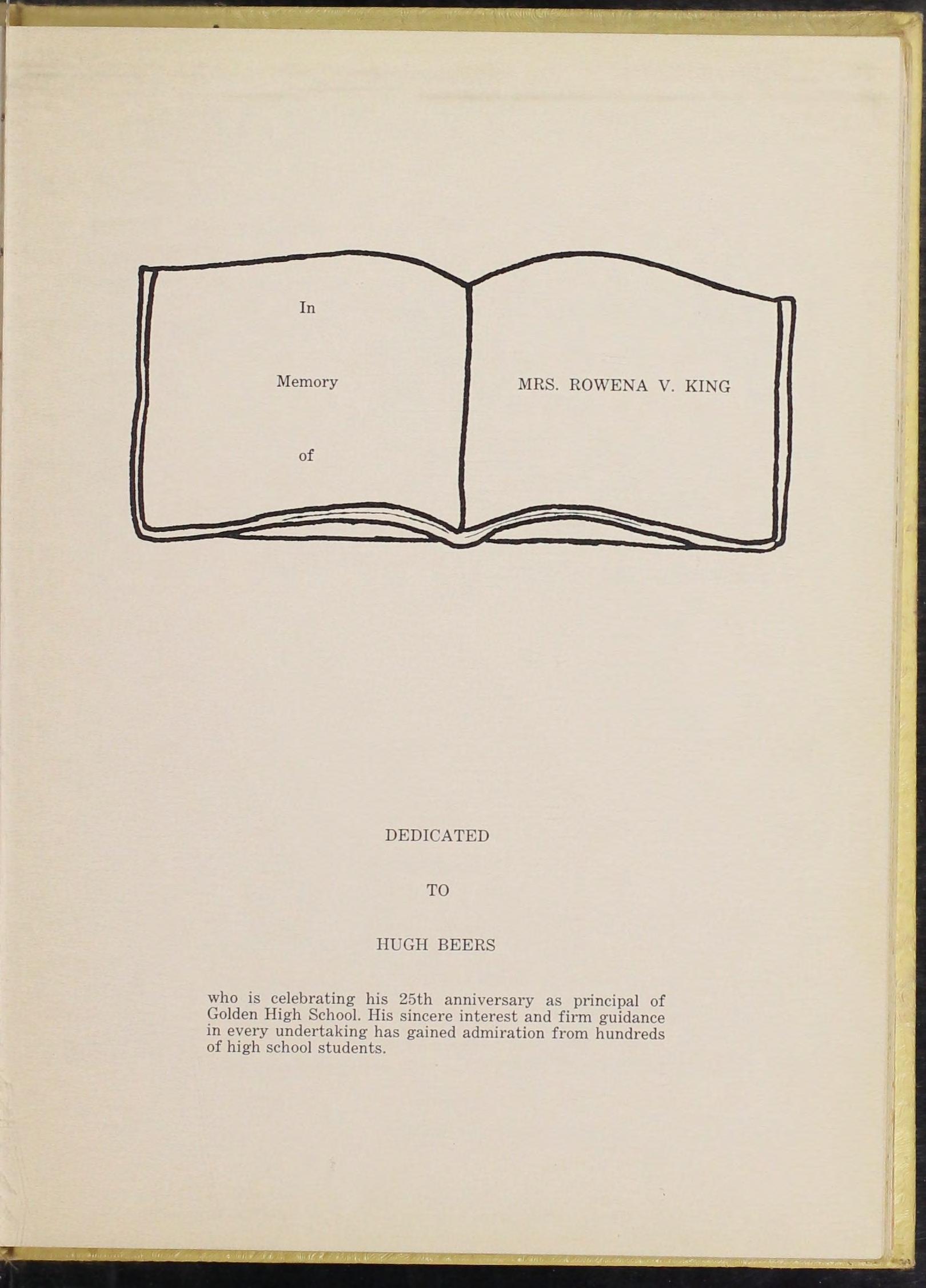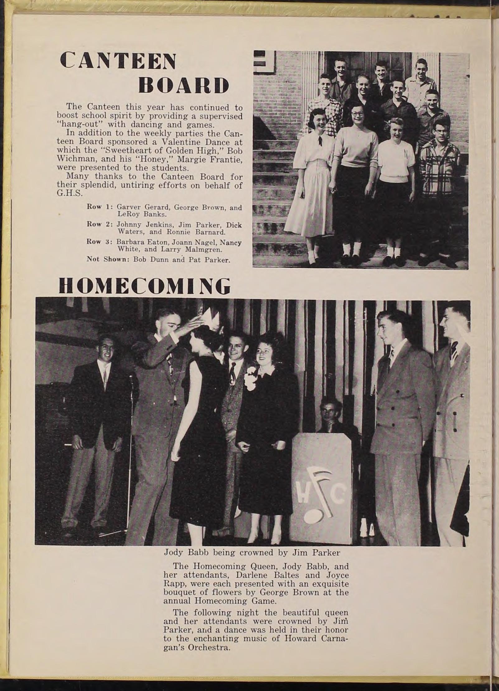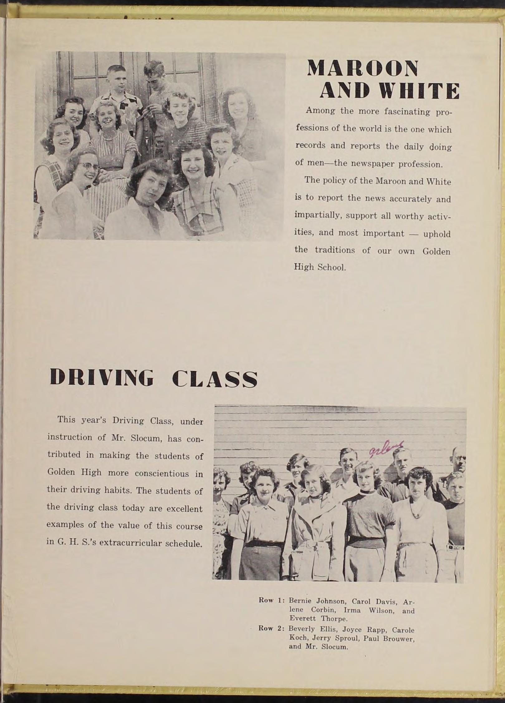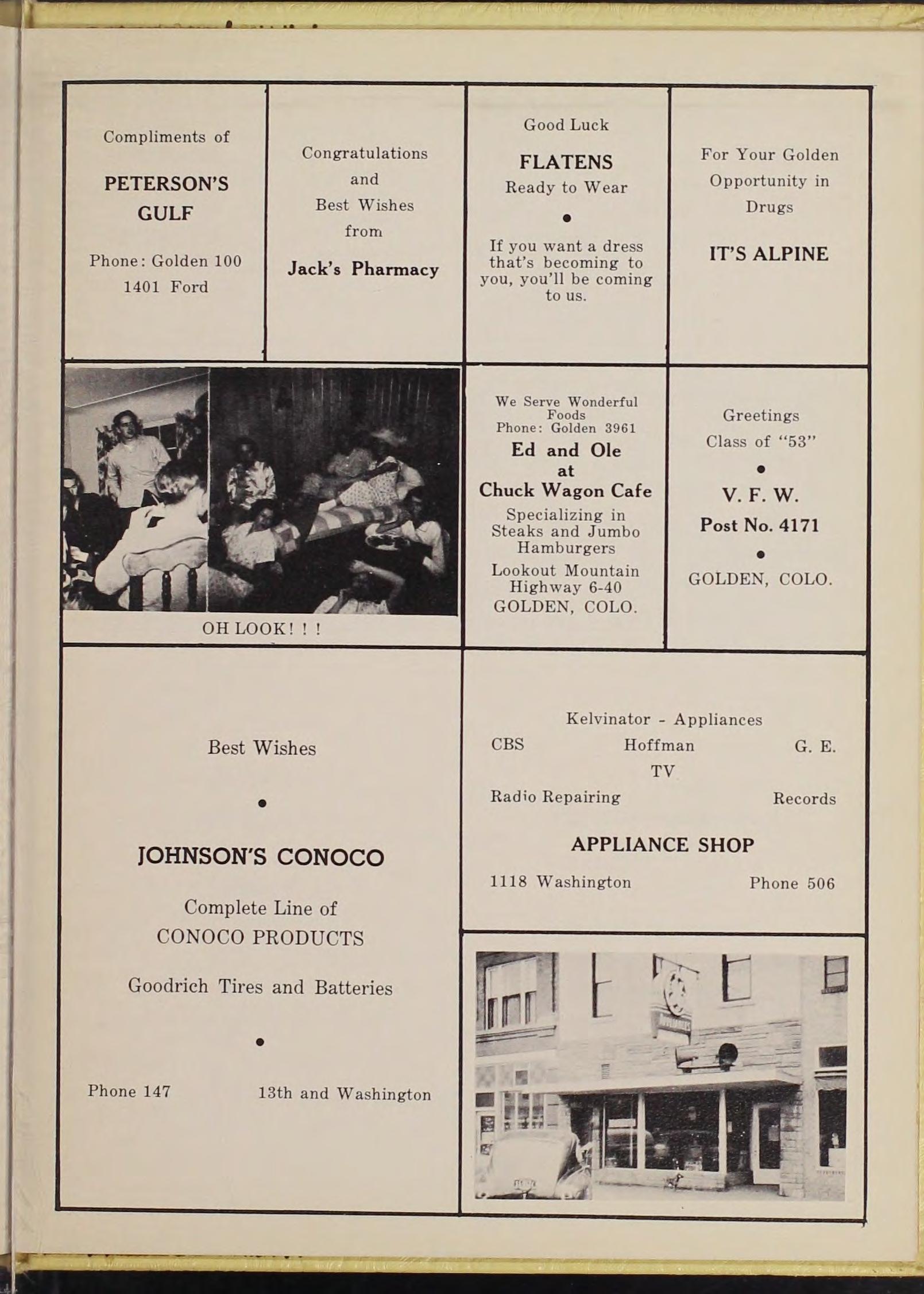 1 Compliments of Congratulations PETERSON'S and GULF Be st Wi s he s from Phone: Golden 100 Jack's Pharmacy 1401 Ford OH LOOK! ! ! Best Wishes • JOHNSON'S CONOCO Complete Line of CONOCO PRODUCTS Goodrich Tires and Batteries • Phone 147 13th and Wa s hington • Good Luck FLATENS Ready to Wear • If you want a dress that's becoming to you, you'll be coming to us. W e Serve Wonderful Foods Phone: Golden 3961 Ed and Ole at Chuck Wagon Cafe Specializing 1n Steaks and Jumbo Hamburg ers Lo okout Mountain High,vay 6-40 GOLDEN, CO LO. For Your Golden Opportunity in Drugs IT' S ALPINE Greeting s Cla ss of "53" • V. F . W . Post No . 4171 • GOLDEN, COLO. CBS Kelvinator - Applian ces Hoffman G. E. TV Radio R e pairing Record s APPLIANCE SHOP 1118 Wa shington Phone 506 a =--- -