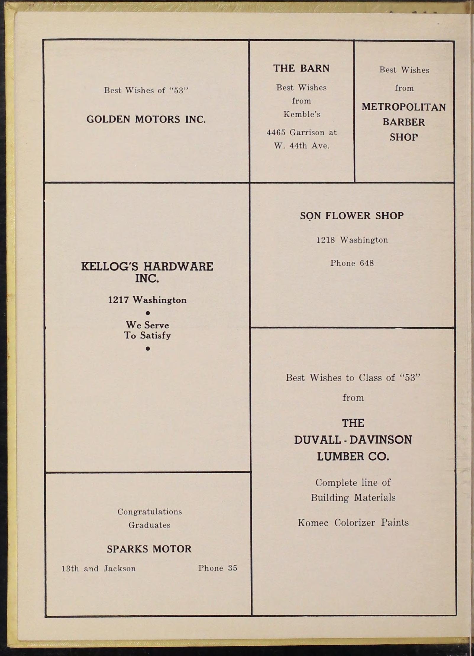 B est Wi s he s of "53" GOLDEN MOTORS INC. KELLOG'S HARDWARE INC. 1217 Washington • W e S e rv e To Satisf y • Congratulations Graduates SPARKS MOTOR 13th and Jackson Phone 35 THE BARN Be st Wi s he s from Kernble' s 4465 Garrison at W 44th Ave Best Wi shes from METROPOLITAN BARBER SHOP SON FLOWER SHOP1218 Wa shingto n Phone 648