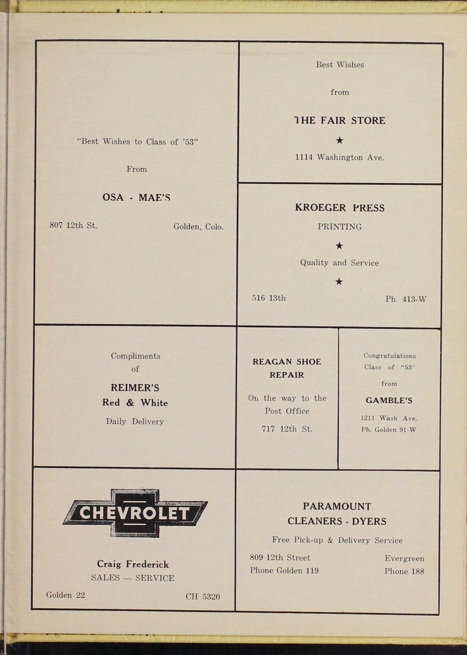 "Best Wishes to Cla ss of '53" From OSA - MAE 'S 80 7 12th St. Golden, Co lo . Golden 22 Compliments of REIMER'S Re d & Whit e Daily D elivery Craig Fre deric k SA LES - SERV I CE CH 5320 Best Wishes from 1 HE FAIR STORE * 1114 Washington Ave. KROEGER PRESS PRINTING * Quality and Service * 5 16 13th Ph 413-\iV Congratulation s REAGAN SHOE C la ss of "53 REPAIR from Oh the way to the GAMBLE 'S Post Office 1211 Wa s h Ave. 717 12th St. Ph. Gold e n 91 - W PARAMOUNT CLEANERS - DYERS Free Pick-up & De1ivery Service 809 1 2t h Street Phone Go ld e n 119 Evergreen Phone 188