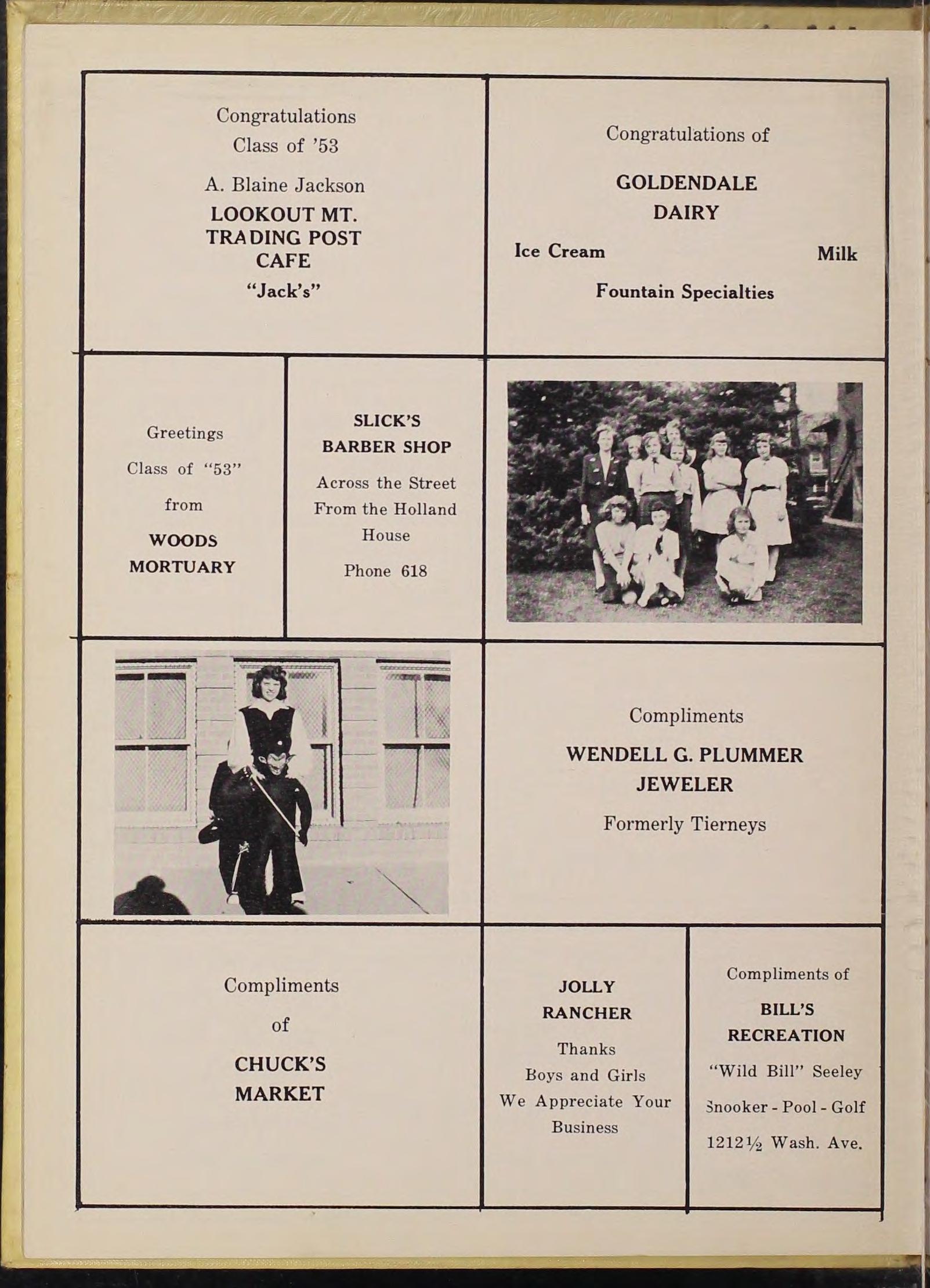 r Congratulati ons C l ass of '53 A. Blaine Jackson LOOKOUT MT. TRADING POST CAFE ''Jack's" Greeting s Cla ss of "53" from SLICK'S BARBER SHOP WOODS MORTUARY l i---. t t' : . _Jr-----~ 1 , •tj l J ' Acro ss the Street From the Holland Hou s e Phone 6 18 .. Comp lim en ts of CHUCK'S MARKET Ice Cream Congratulatio n s of GOLDENDALE DAIRY Fountain Specialties Co mplim ents WENDELL G. PLUMMER JEWELER Formerly Tierneys Milk JOLLY Compl im ents of RANCHER BILL'S RECREATION Thank s Boys and Girls "Wild Bill" Seeley We Appreciate Your 3nooker - Pool - Golf Bu s iness 1 212½ Wash. Ave.