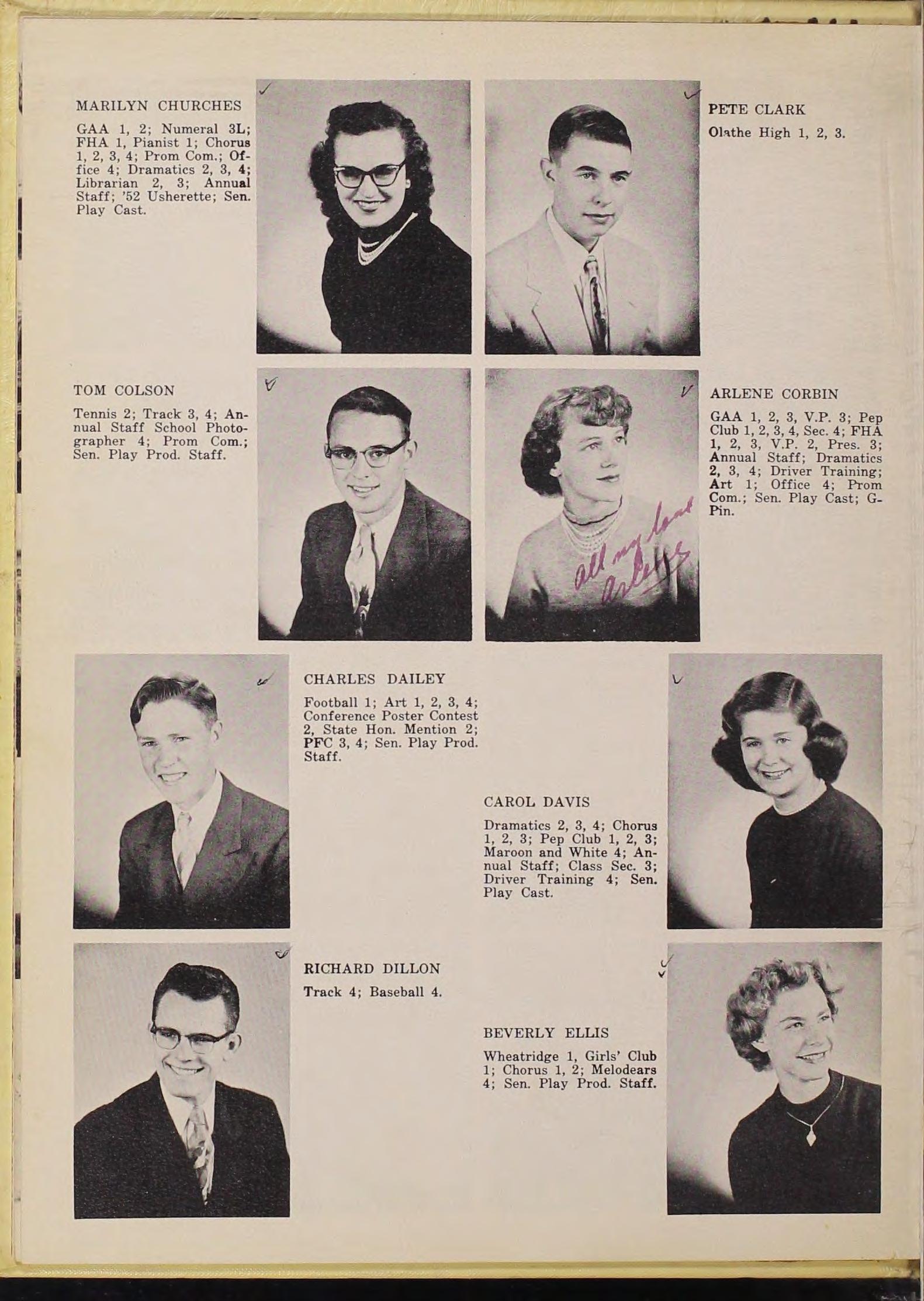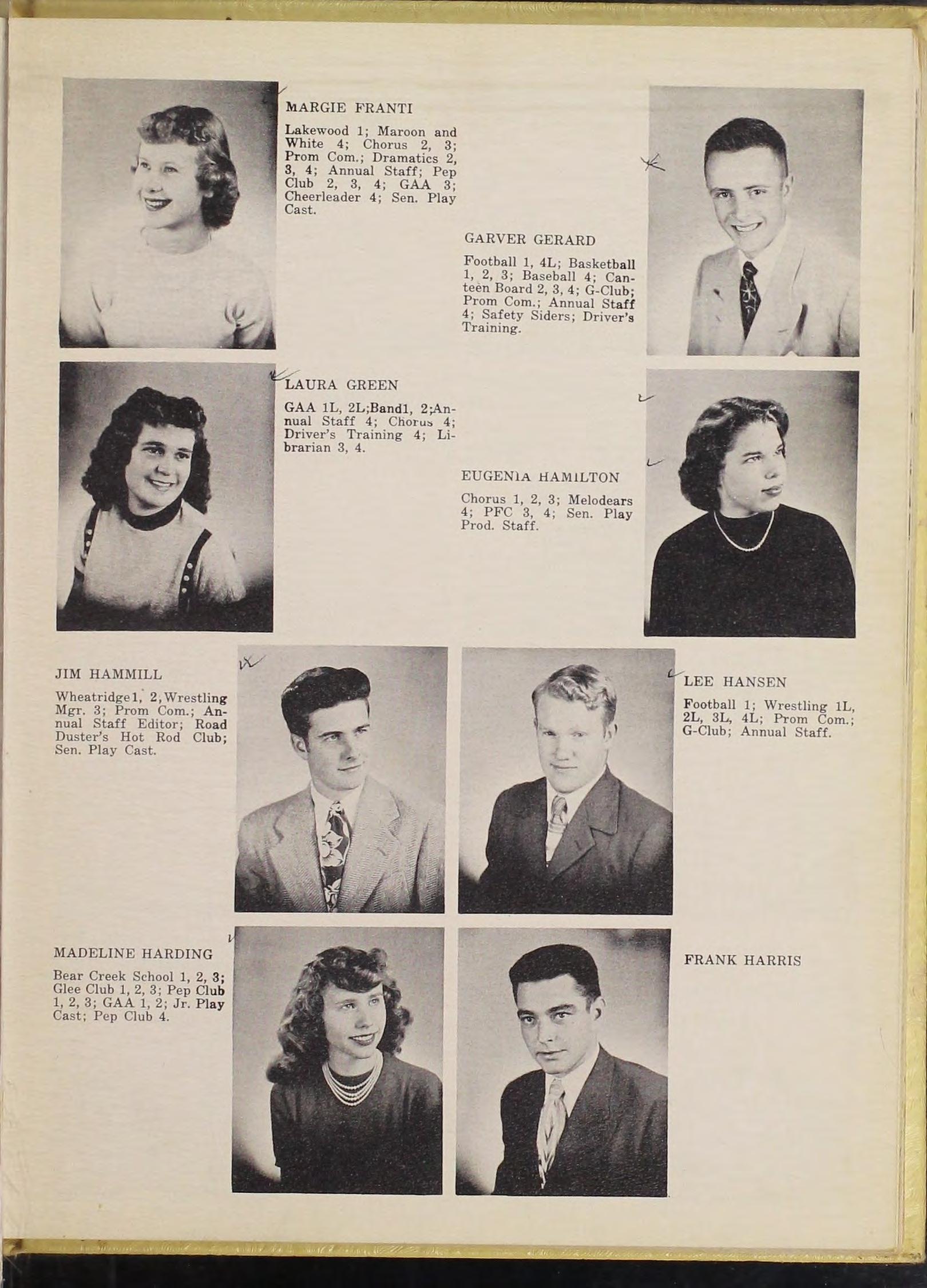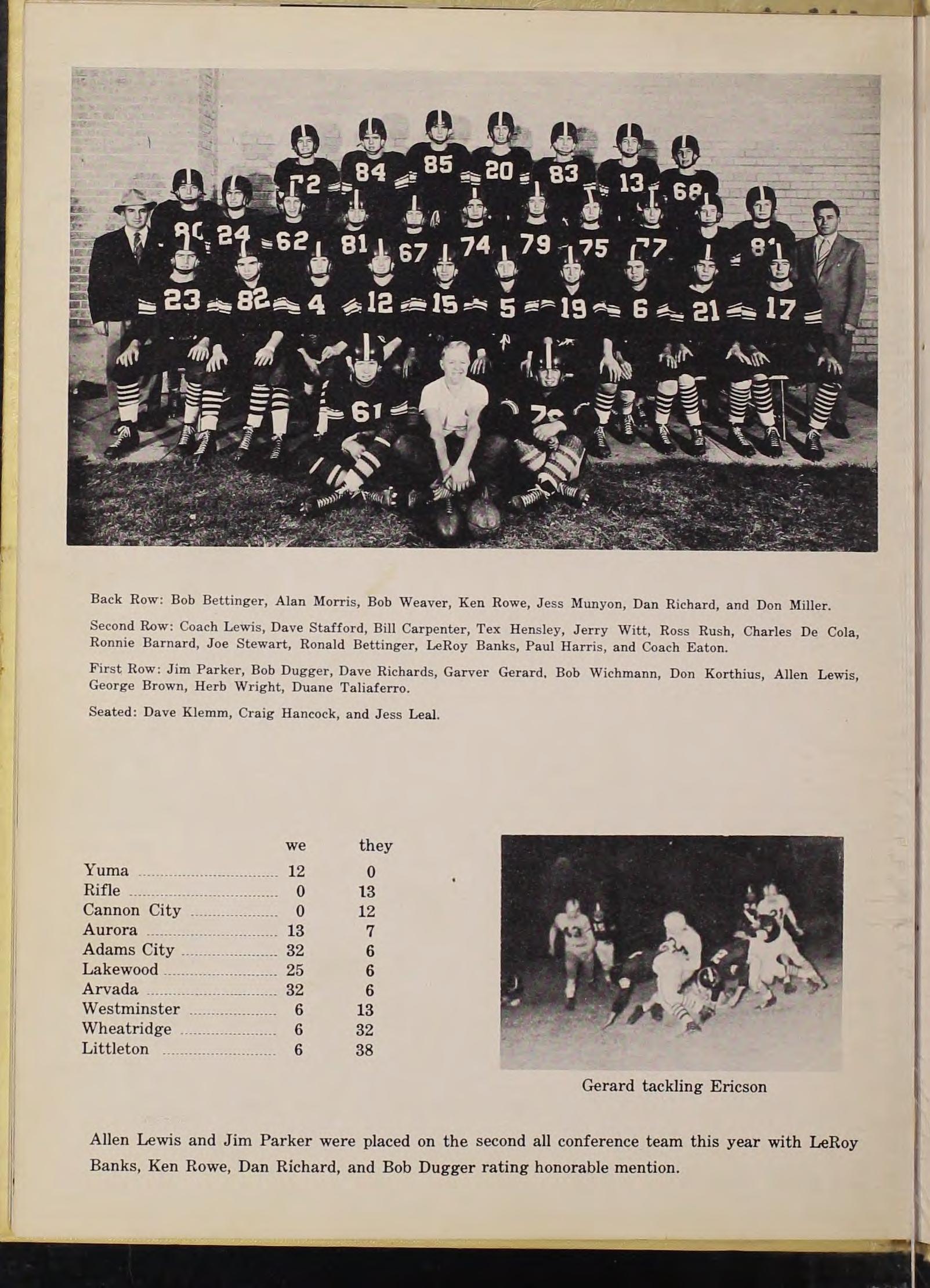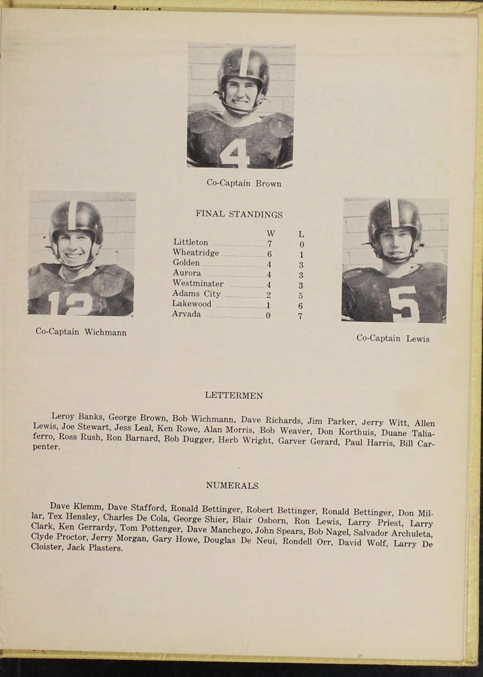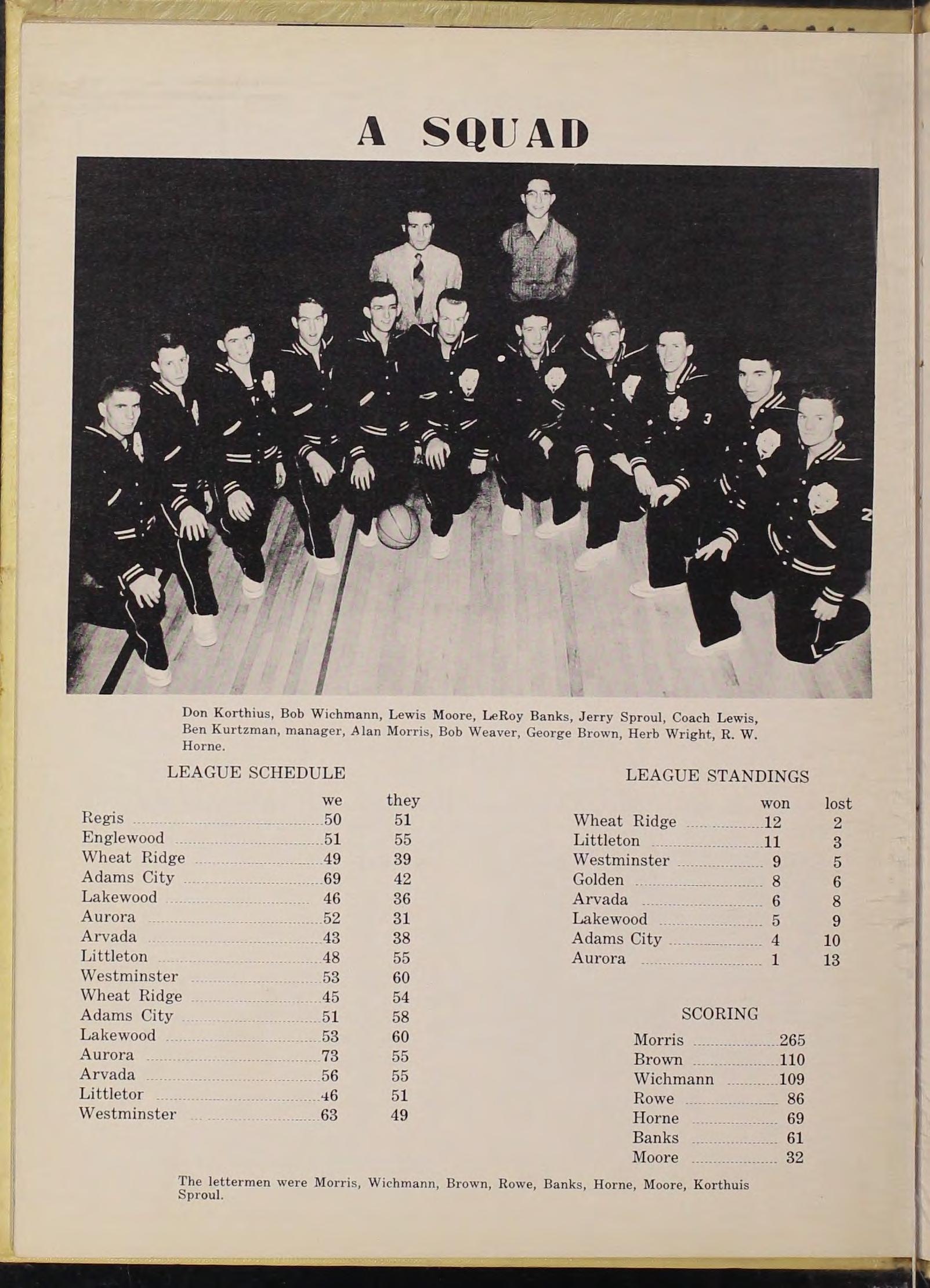 B SQUAD la 88 " 44 • 1' • I • • • , • L• 77 I • • I • • • ) 0 .. .. 0 0 • • • • • -. 0 0 \i 33 Yo0 · 22 ' \ I • ' 66l t ' >I • • • ., • I • I • --• --IYTop Row : D a ve Klemm, L e R oy W ill ia m s , L es K orth u is , D ic k Larew, Gl e nn Tru e , J ack ~f cCr a c k e n . Bottom Row: B ob ?.IcKendry , Vi rgil Mabb, Bo y d H e n s l ey, D ic k Wa te r s, Larry Ma y b erry. LEAGUE SCHED U LE we Regis 23 Englewood 27 \ ¥heat Ridg·e 26 Adams City 33 Lakewood _ ............. ......... .... 36 Aurora Arvada Littleton Westminster ____ Wheat Ridge Adams City L akewood Aurora Arvada L itt leto n- -· - --Westminster . . ... ..... . .......... . 29 37 57 27 19 50 48 2 1 41 39 43 they 20 26 32 22 23 27 18 45 23 31 41 27 28 25 20 34 LEAGUE S TANDINGS Wh e at Ridg e G olden Aur o ra Littleton Lak e wood . Ar v ada vV es tmin s ter Adam s City won 12 11 10 8 6 4 3 2SCORING William s ·-···-- 122 Mabb 94 1Vl.cKendrj· 71 True 66 Hen s ley .. .......... 45 Larew .... ............ 33 Alan Morris made the All- Conferen ce team and Ken Rowe made honorable mention. l os t 2 3 4 6 8 10 11 12 • , I