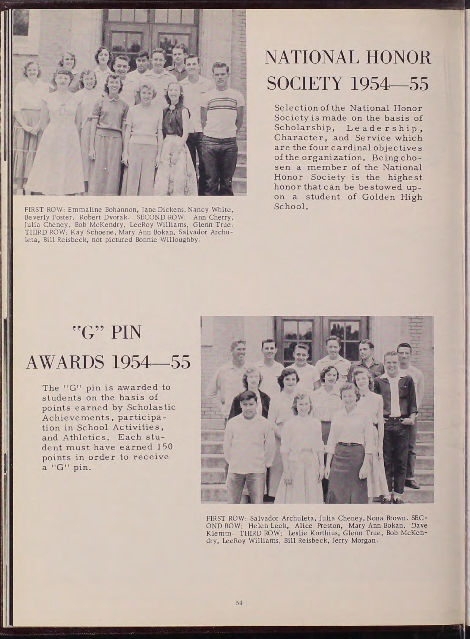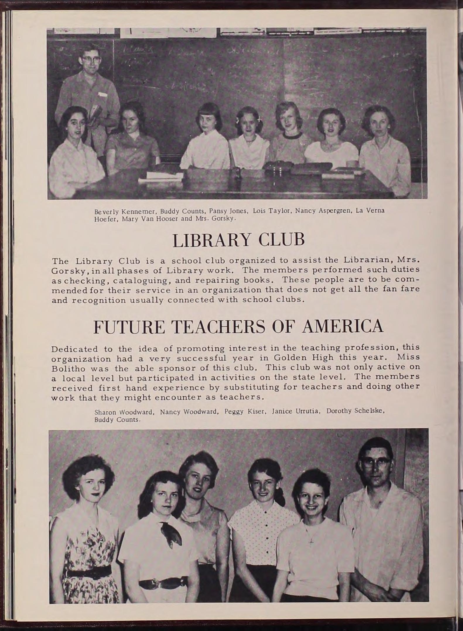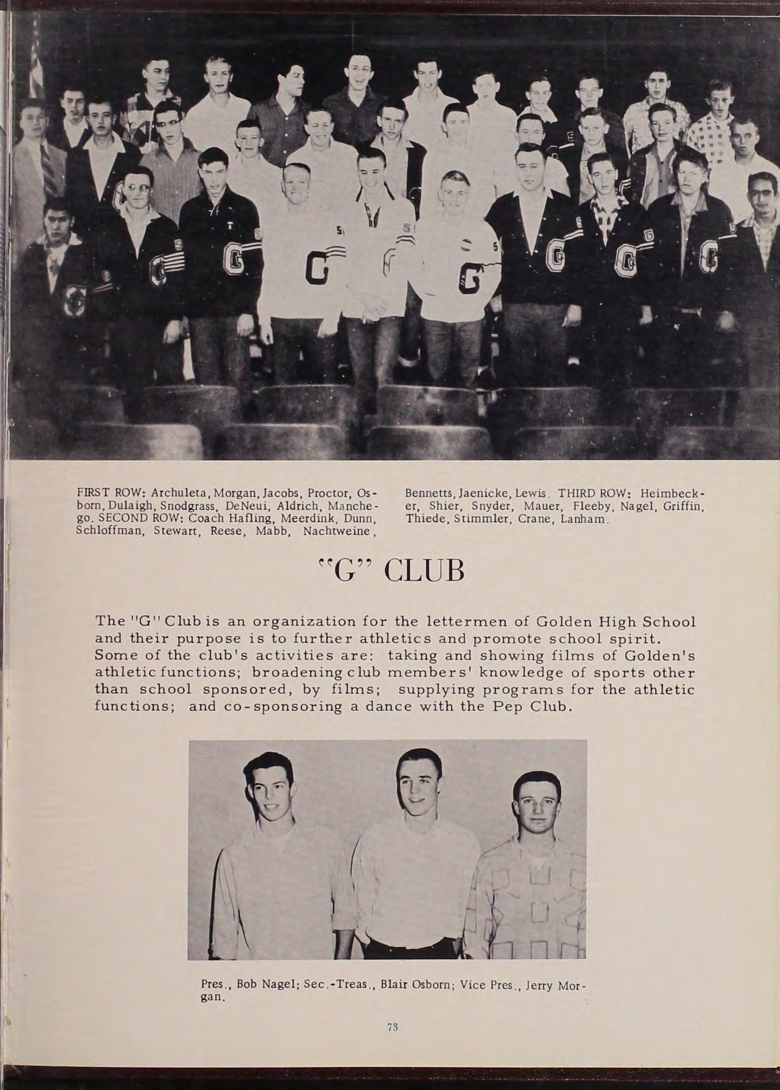 The "G" Club is an organization for the l etterme n of Gold e n High School and their purpose is to further athletics a nd promote school spirit . Som e of t h e c lub's activities are: taki ng and showing films of Golden's athl etic functio ns ; broadening club members' knowledge of spo rts other than sc ho ol sponsored, by fi lms; supp lyin g program s fo r the ath leti c functio ns ; and co -sponsor i ng a dance with the Pep Club