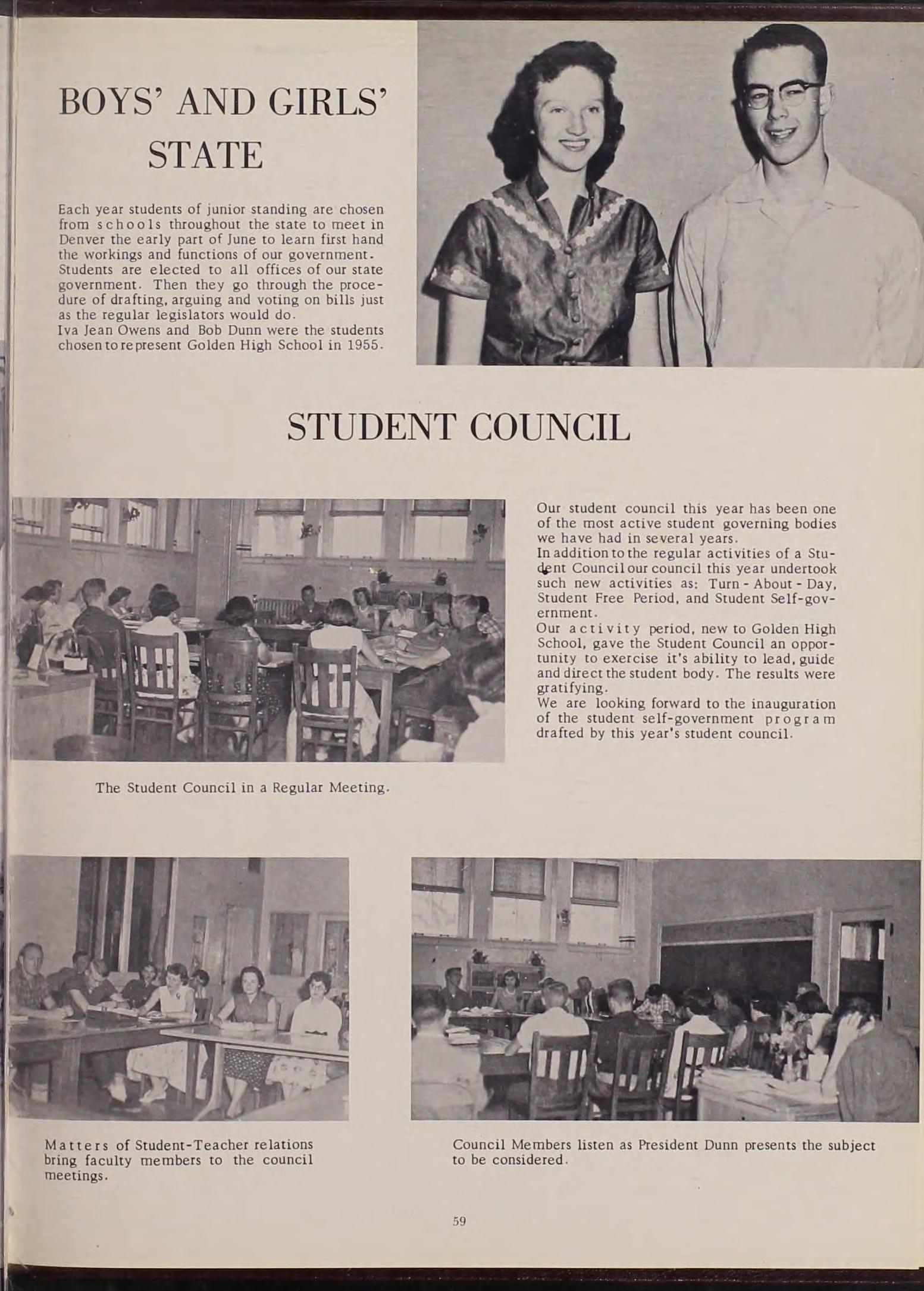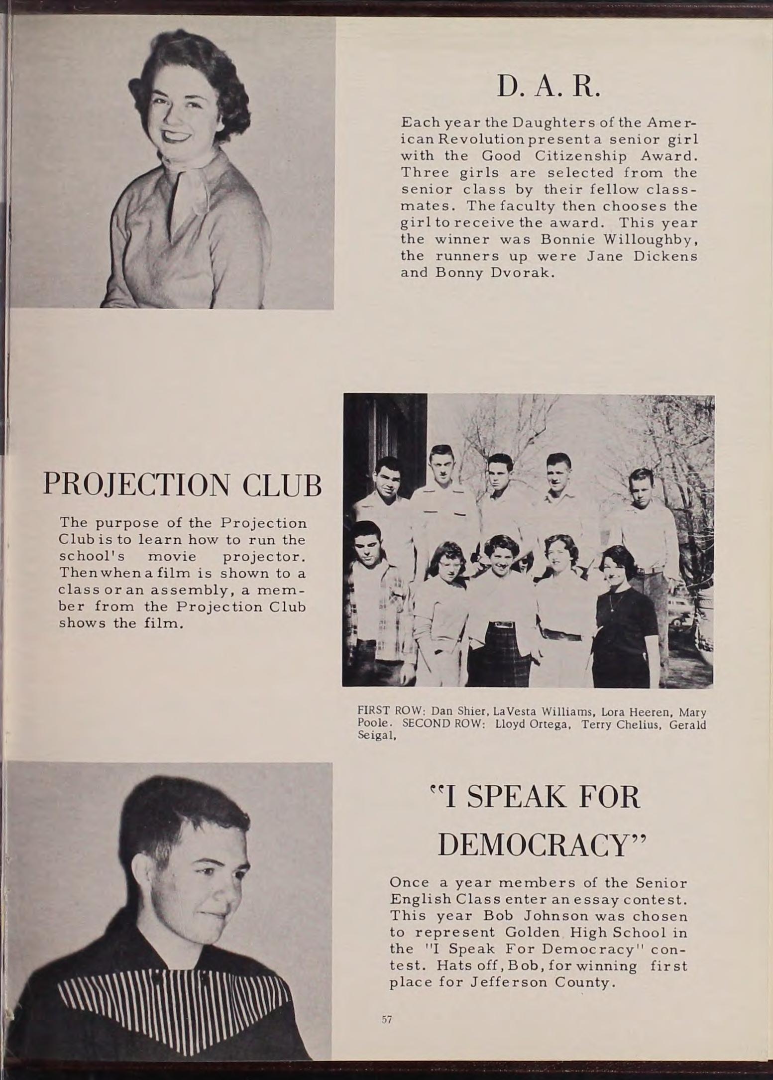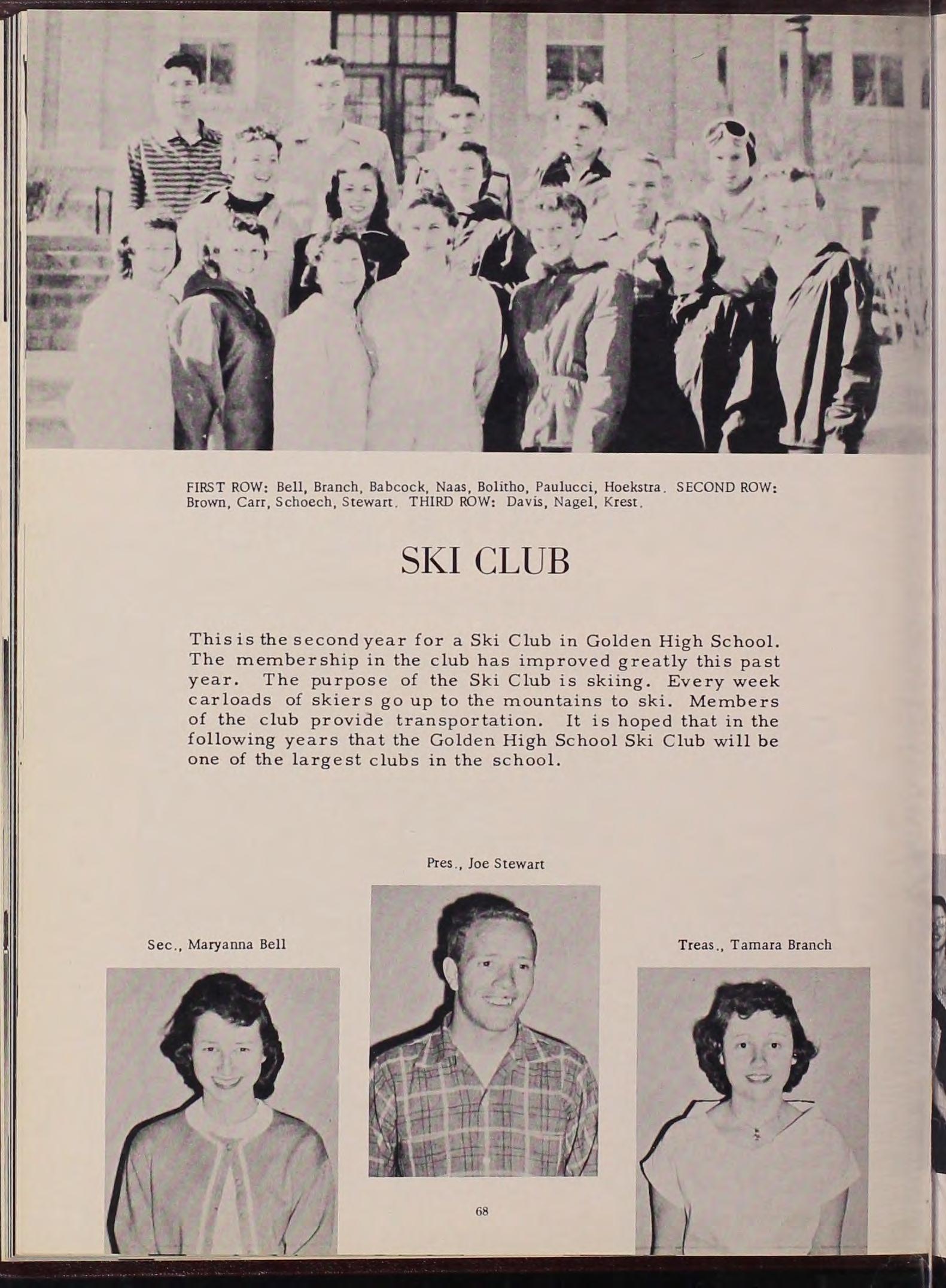 The "G" Club is an organization for the l etterme n of Gold e n High School and their purpose is to further athletics a nd promote school spirit . Som e of t h e c lub's activities are: taki ng and showing films of Golden's athl etic functio ns ; broadening club members' knowledge of spo rts other than sc ho ol sponsored, by fi lms; supp lyin g program s fo r the ath leti c functio ns ; and co -sponsor i ng a dance with the Pep Club
