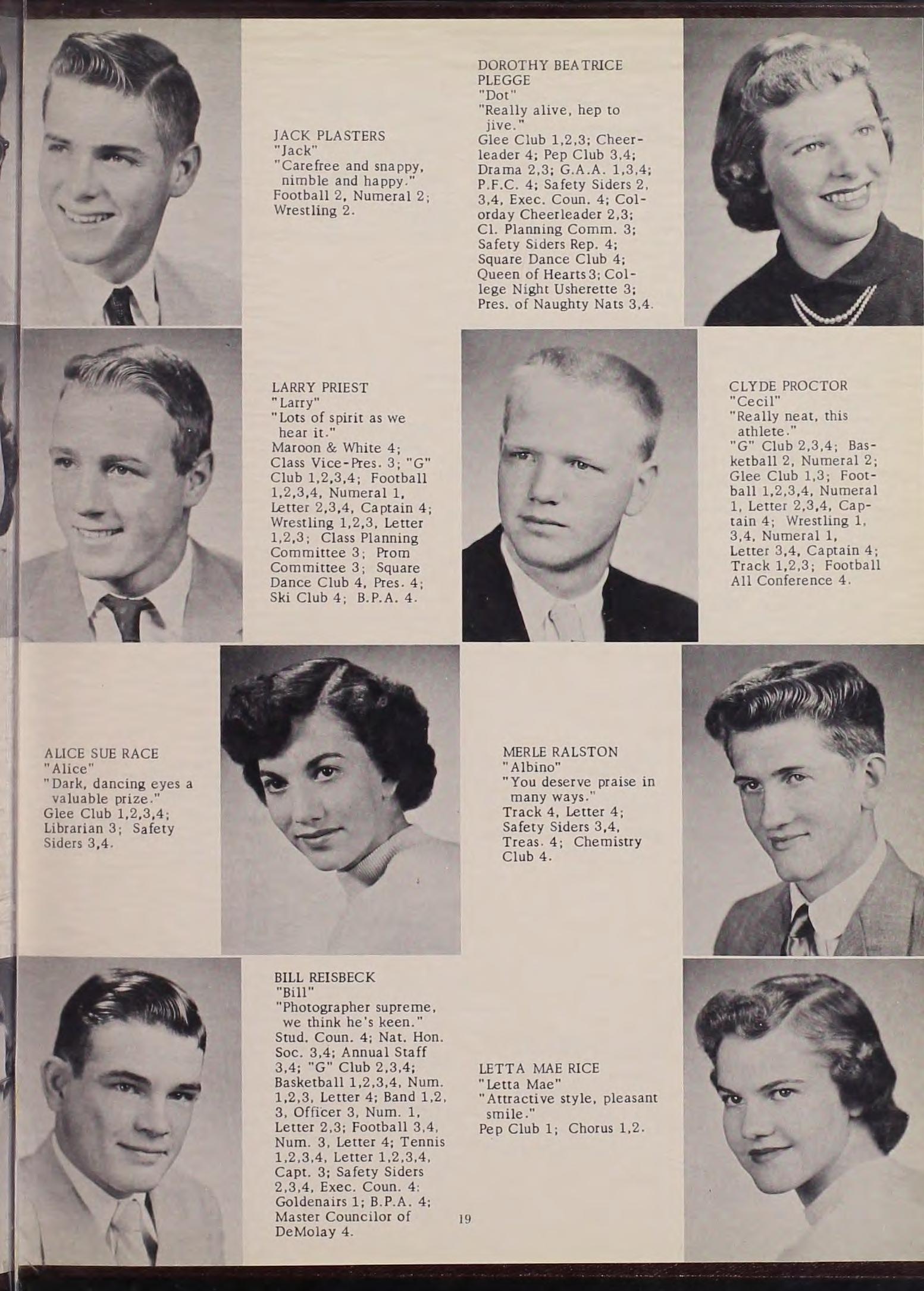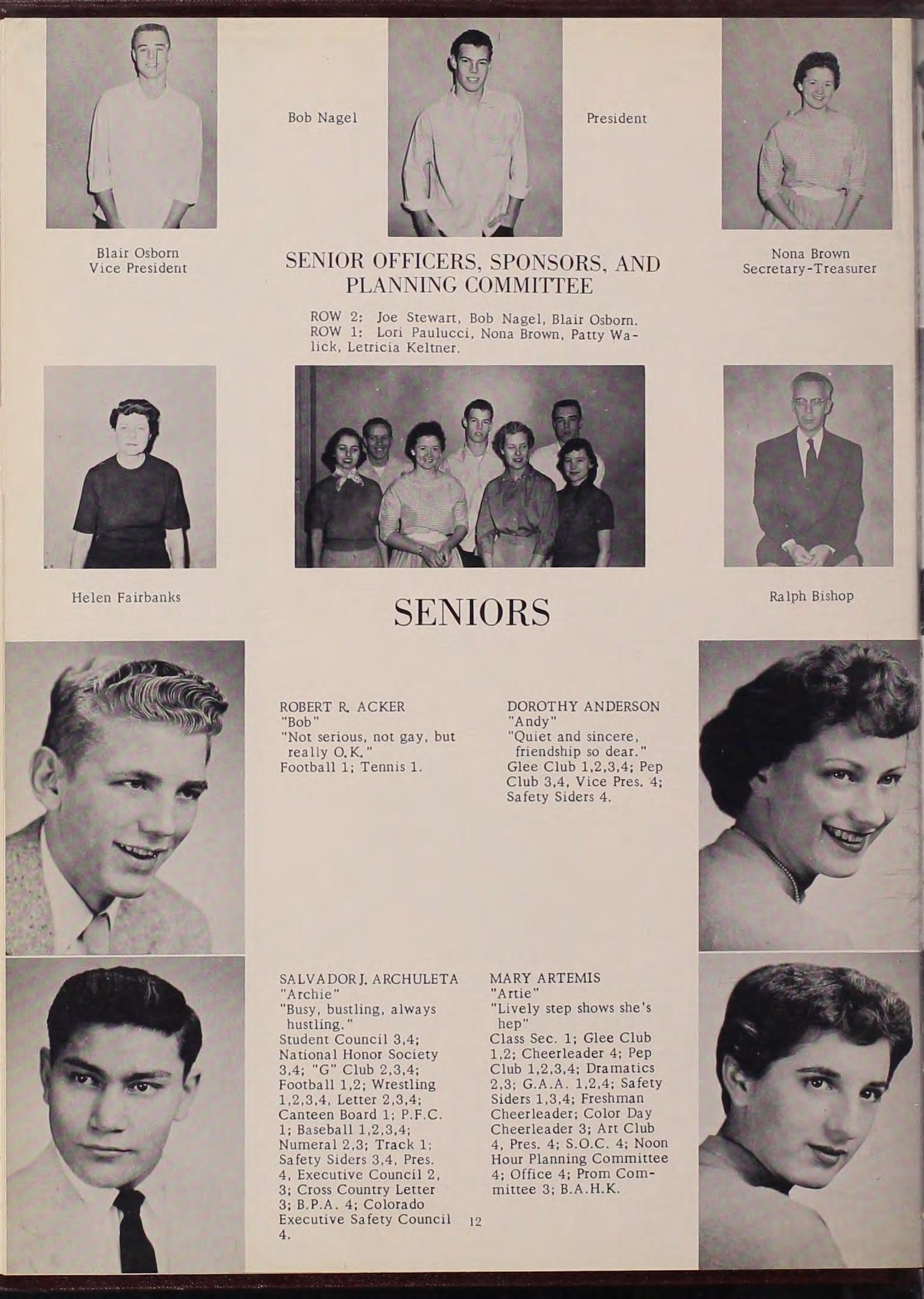Student Council 3,4; Nanonal Honor Society 3,4; "G" Club 2,3,4 ; Football 1,2: Wrestling 1,2,3,4, Letter 2,3,4; Canteen Board 1; P.F.C. l; Baseball 1,2,3,4; Numeral 2,3; Track 1. Safety Side r s 3 ,4. Pres. 4, Executive Council 2, 3; Cross Country Letter 3; B.P.A. 4; Colo r ado Exe cutive Safety Council 4. 12