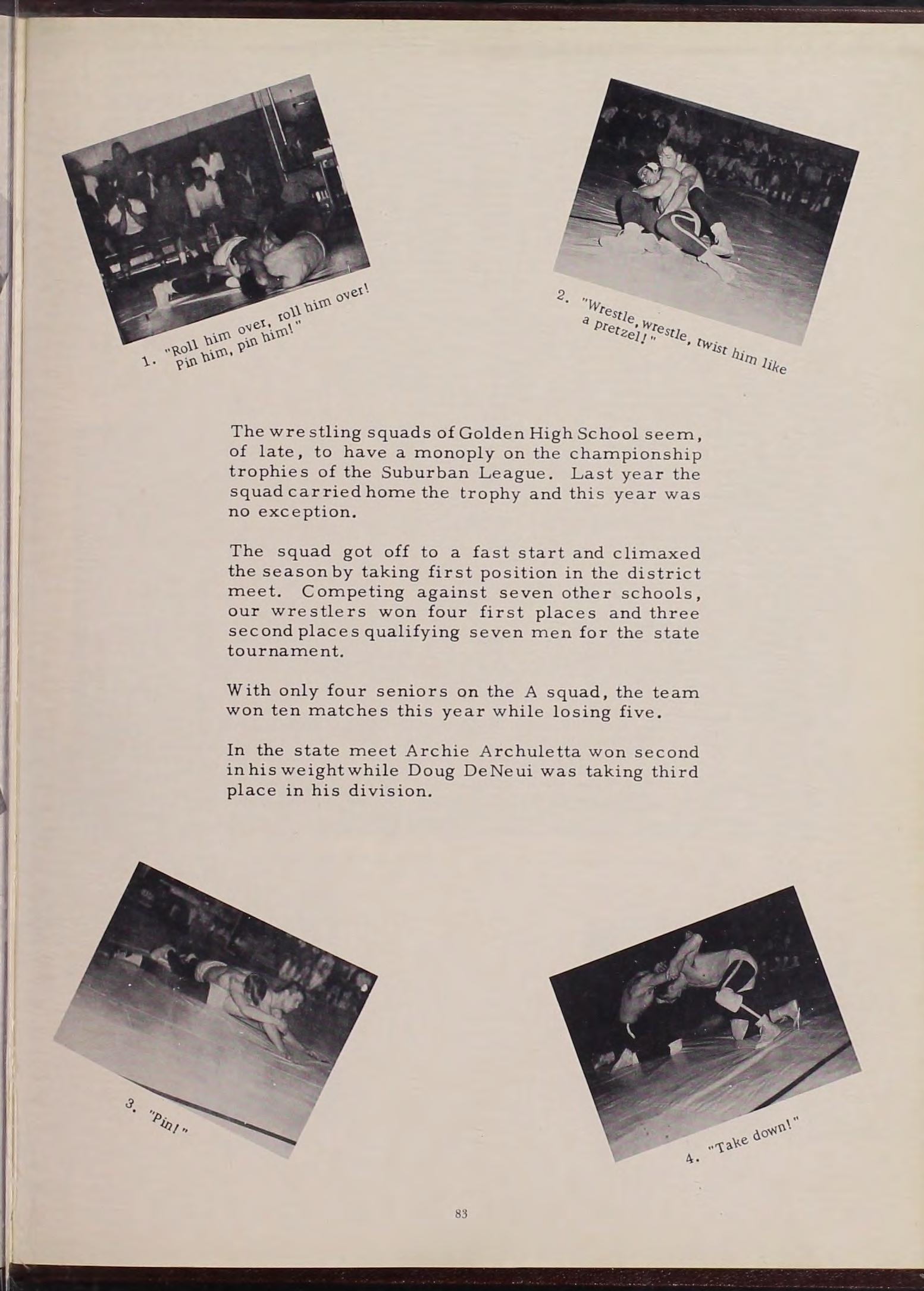 The wrestling squads of Golden High School seem, of late, to have a monoply on the championship trophies of the Suburban League. Last year the squad carried home the trophy and this year was no exception .
