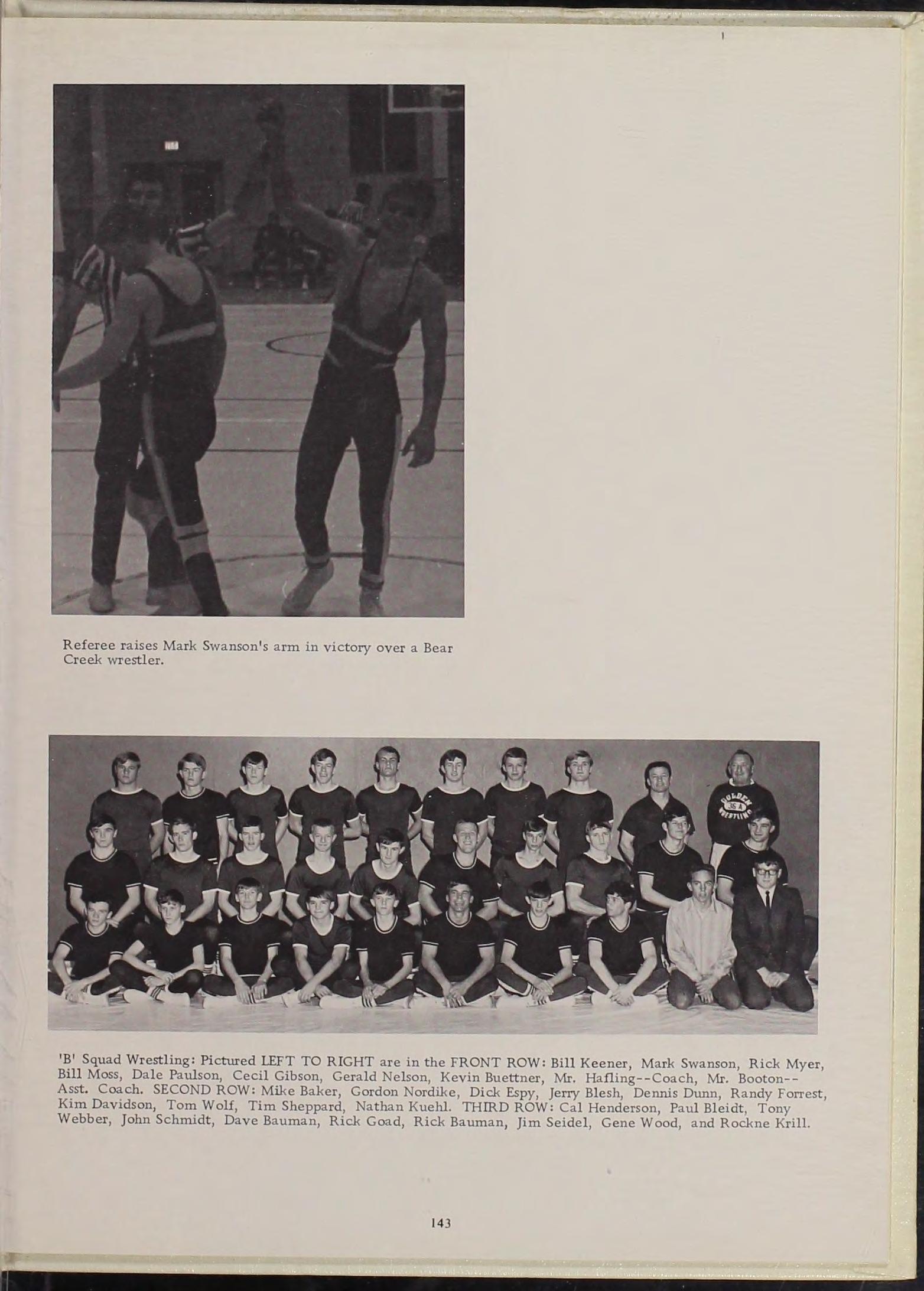 'B ' Squad Wrestling: Pictured LEFT TO R I GHT are in the FRONT ROW : Bill Keener, Mark Swanson, Rick Myer, Bill Moss, Dale Paulson, Cecil Gibson , Gerald Nelson, Kevin Buettner, Mr. Hafling--Coach, Mr. Booton-Asst Coach SECOND ROW: Mike Baker, Gordon Nordike, Dick Espy, Jerry Blesh, Dennis Dunn, Randy Forrest, Kim Davidson, Tom Wolf, Tim Sheppard , Nathan Kuehl. THIRD ROW: Cal Henderson, Paul Bleidt, Tony Webber, J ohn Schmidt, Dave Bauman, Rick Goad, Rick Bauman, Jim Seidel, Gene Wood , and Rockne Krill.