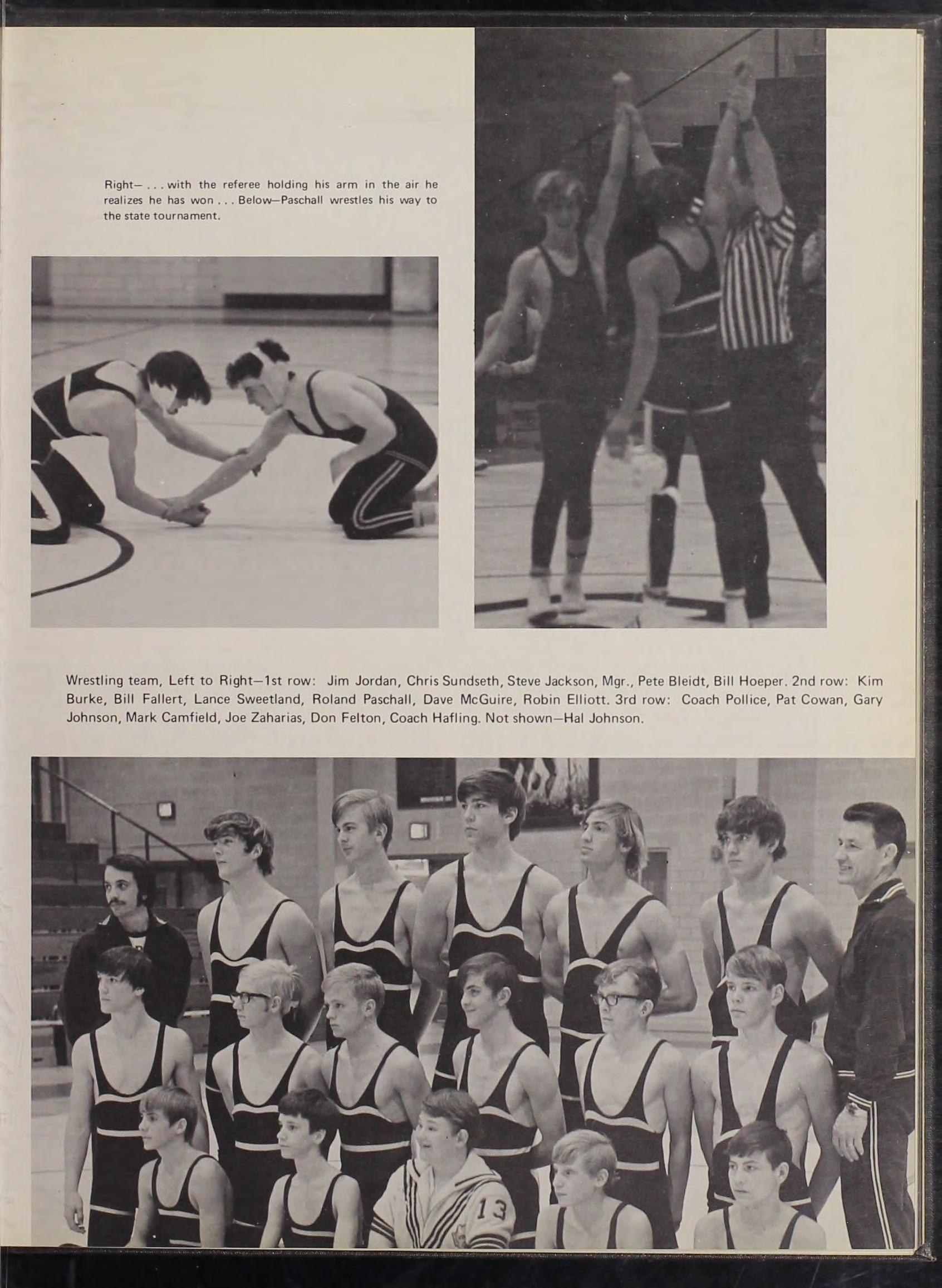 Wrestling team , L eft to Right- 1st row Jim J or da n, Chris Sundseth, Steve Jac k son, Mgr , Pete Ble1dt, Bi ll Hoeper 2nd r ow Kim Burke, Bill Fall ert, Lan ce Sweetland, Roland Pa schall , D ave McGuire, Robrn Elliott 3rd row Coach Po llr ce, Pat Cowan, Gary John so n , Mark Camfield, Joe Zahanas, Don F elto n, Coach H afl Ing N ot shown - H al Johnson