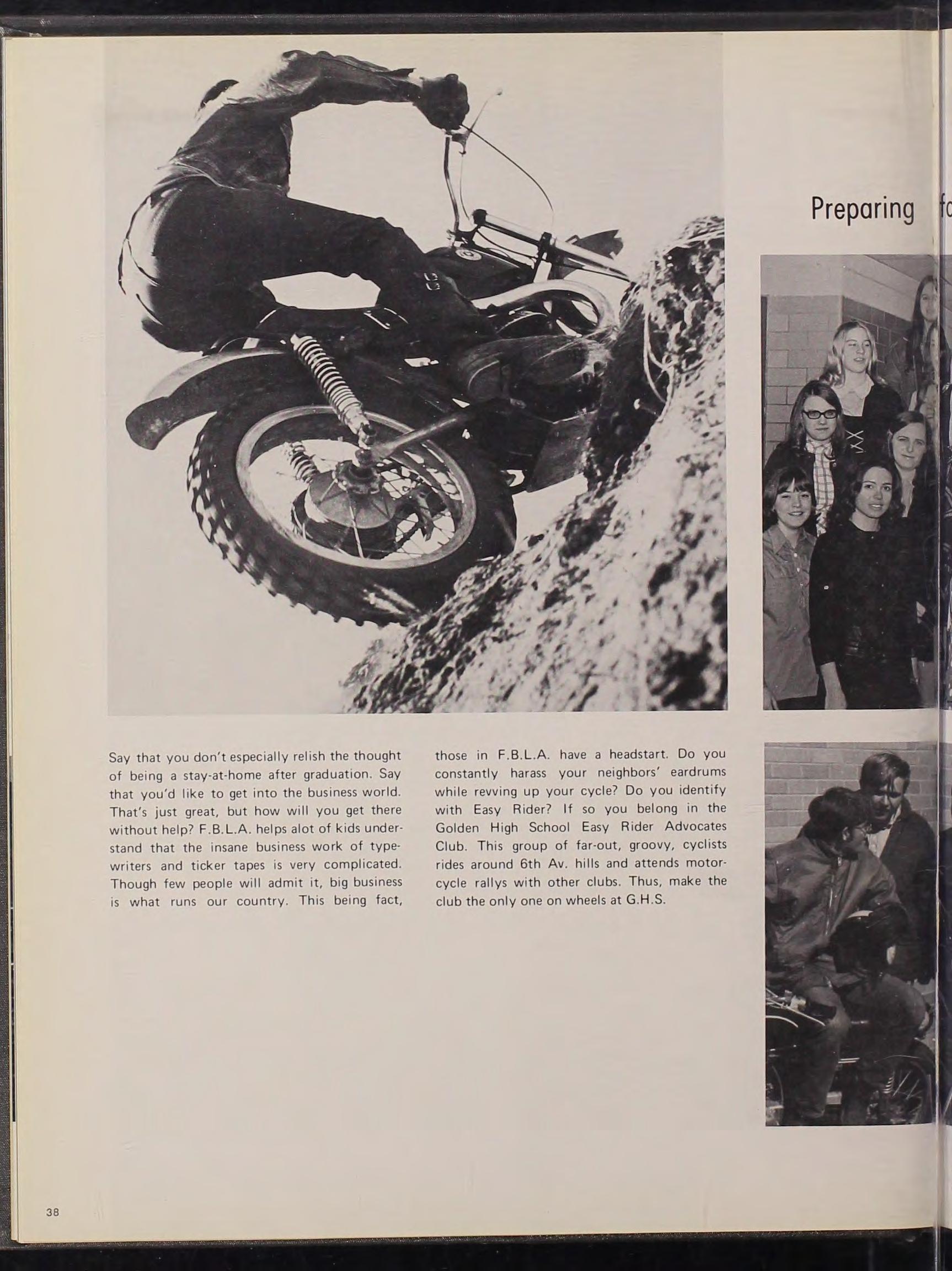 those in F 8 L A have a headstart. Do you constantly harass your neighbors' eardrums while revving up your cycle? Do you identify with Easy Rider? I f so you belong in t he Golden High School Easy Rider Advocates Club This group of far-out, groovy, cyclists rides around 6th Av. hills and attends motorcycle rallys with other c l ubs. Th us, make the club the only one on wheels at G. H .S.