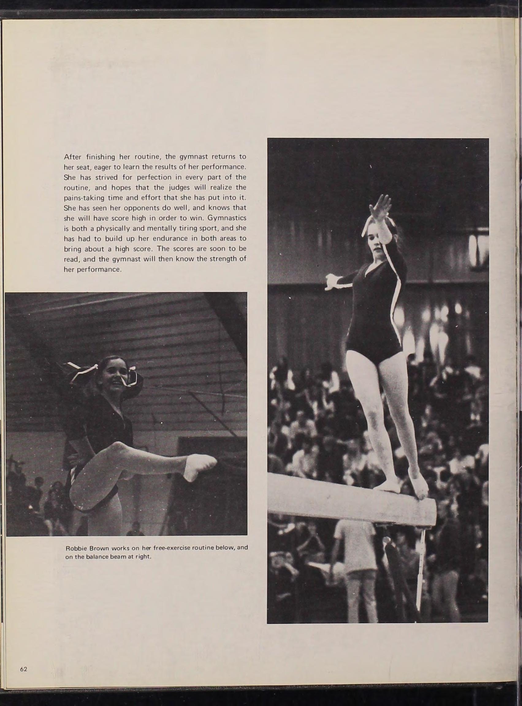 Robbie Brown works on her free-exercise routine below, and on the balance beam at right.