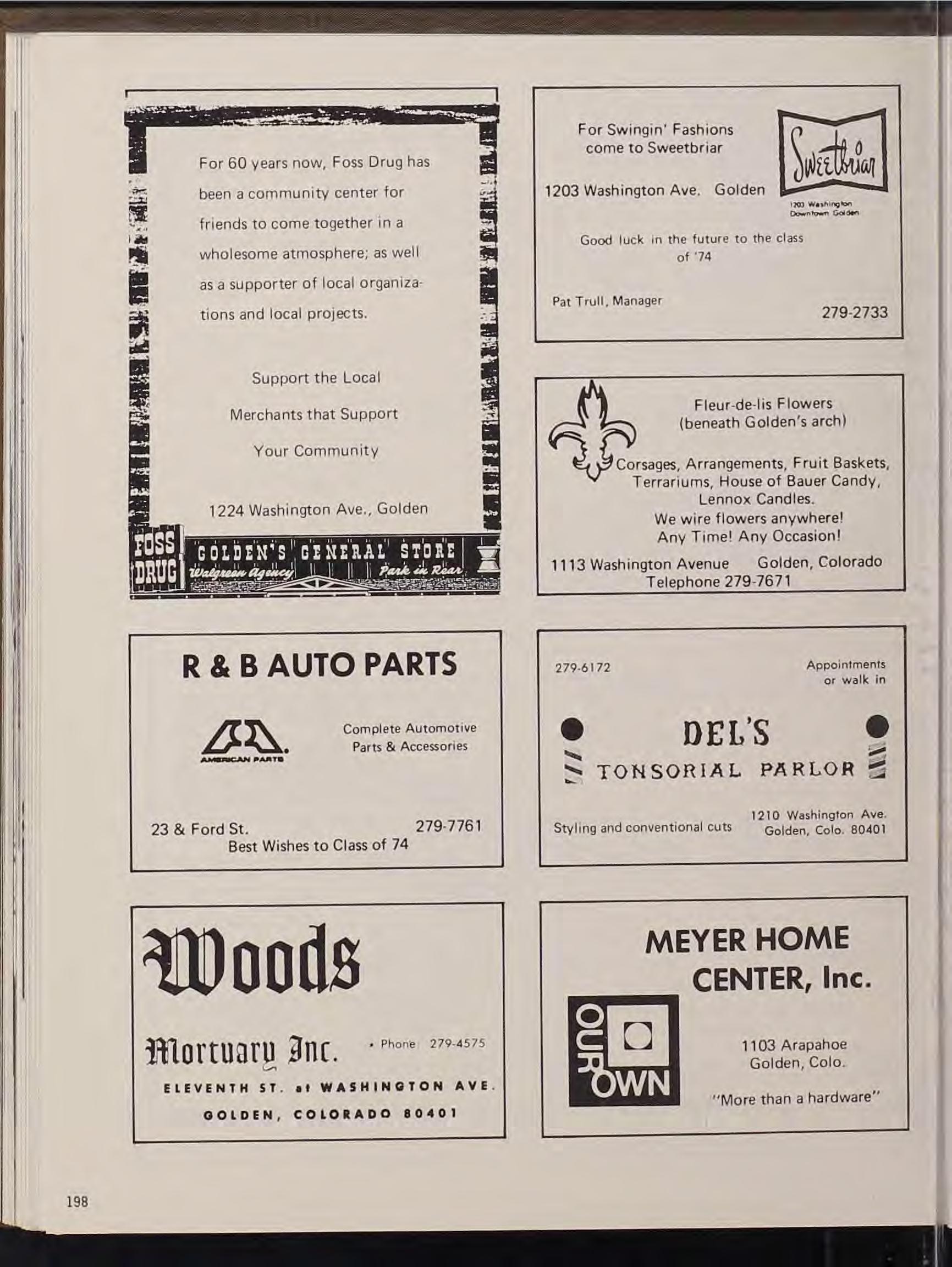 I I I 19 8 • ,.ioe:; = c'I ....,. ,, F or 60 years now, Foss Drug has been a comm u nity center for friends to come toge t her in a wholesome atmosphere; as well as a supporter of local organ1zat 1ons and local projects. Suppo rt t h e Local Merc han t s that Support Your Comm un i t y 12 24 Wa shingt on A ve., G ol d en R & B AUTO PARTS At ~•H ~AATII C o mpl et e Aut o mot i ve Parts & A cc esso ri es . 23 & Ford St 279 -7761 Best Wishes to Class of 74 fflortuarg inc. , Phon~ 279 -4575 ELEVENTH ST at WASHINGTON AVE GOLDEN, COLORADO 80401 For Swingin ' Fash ions c ome to Sweetbr i ar 1203 Washington Ave Golden Good l uck ,n the future to th e c l ass of '7 4 Pat Tr ull, M anager 279 -2733 F leur -de-lis Flowers (beneath Golden's arch) Corsages , Arrangements , Fruit Baskets, Terrariums , House of Bauer Candy , Lennox Candles. We wire flowers anywhere! Any Time ! Any Occasion! 1113 Washington Avenue Golden, Colorado 279 -6 172 • Telephone 279 -7671 DEL'S A p po in tments or wa l k in • TONSORIAL PARLOR 1210 Wa sh i ngton Ave Styli n g an d conven t io n al cuts Gol d e n , Co lo 8 0401 MEYER HOME CENTER, Inc. 1103 Ar apahoe Golden , Co lo " More than a hardware"