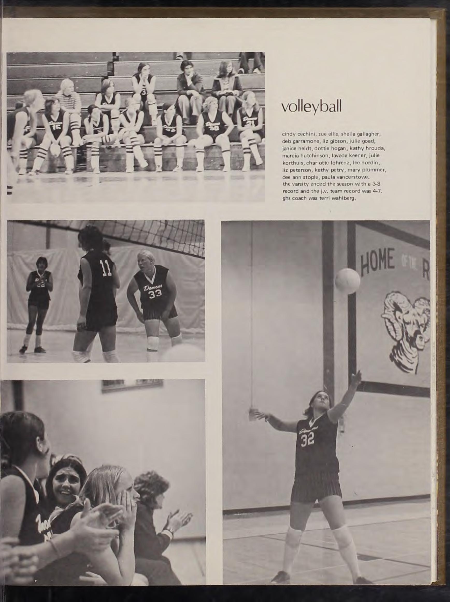 cindy cechini, sue ell is. sheila gallagher, deb garramone, hz 91bson, Julie goad, janice heldt, dottJe hogan, kathy hrouda, marcia hutch1nson , lavada keener, julie korthu1s, charlotte lohrenz, lee nordin, llz peterson, kathy peuy, mary plummer, dee ann stople, paula vanderstovve. the vars, ty ended the season with a 3-8 record and the J.v. team record was 4-7 ghs coach was tern wahlberg.