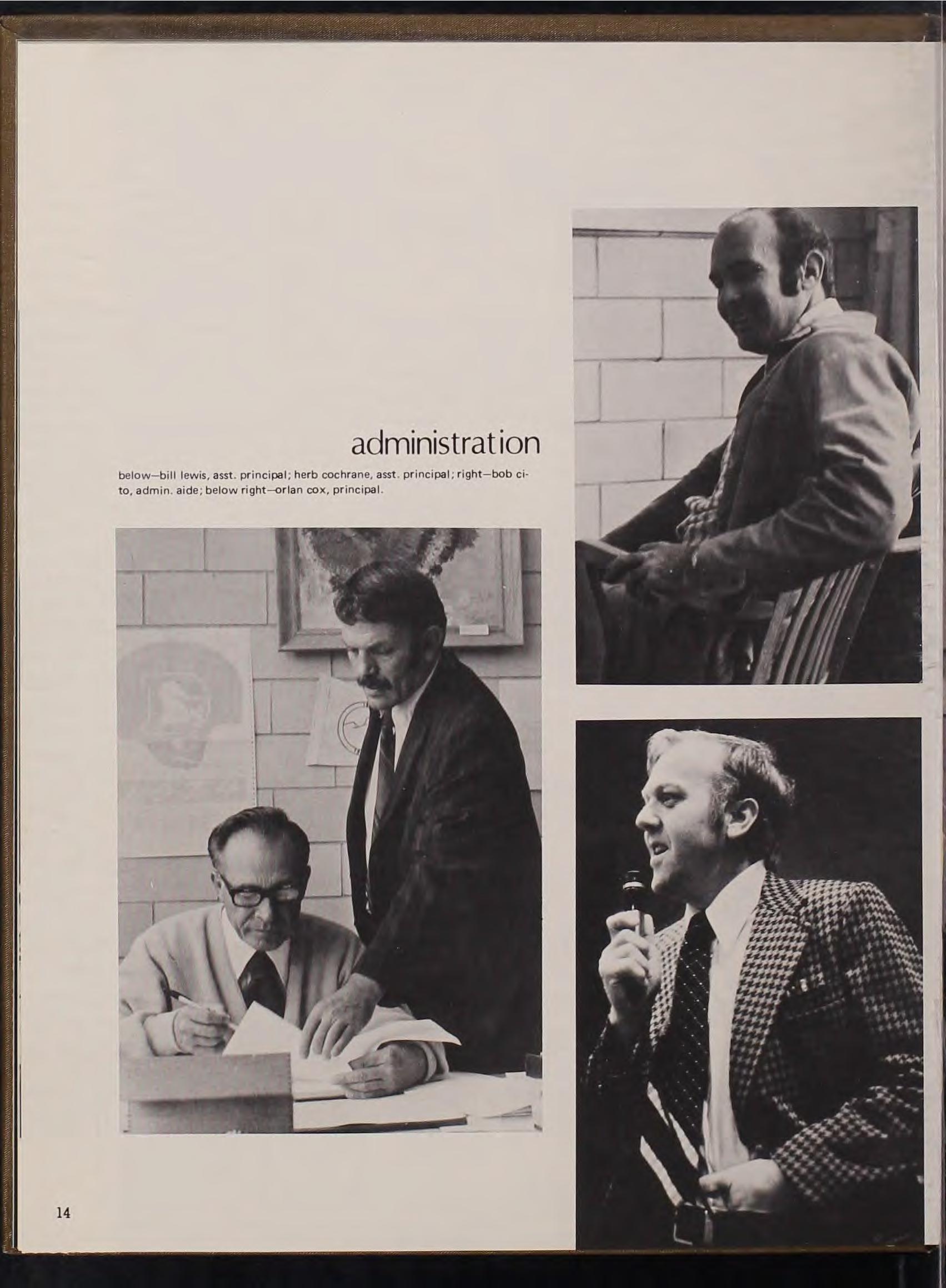 • administration be low - bill le wis , asst principal ; he r b cochran e, asst p r inc ipal ; r ight - bob cito , admin aide ; below right-o r lan cox , principal