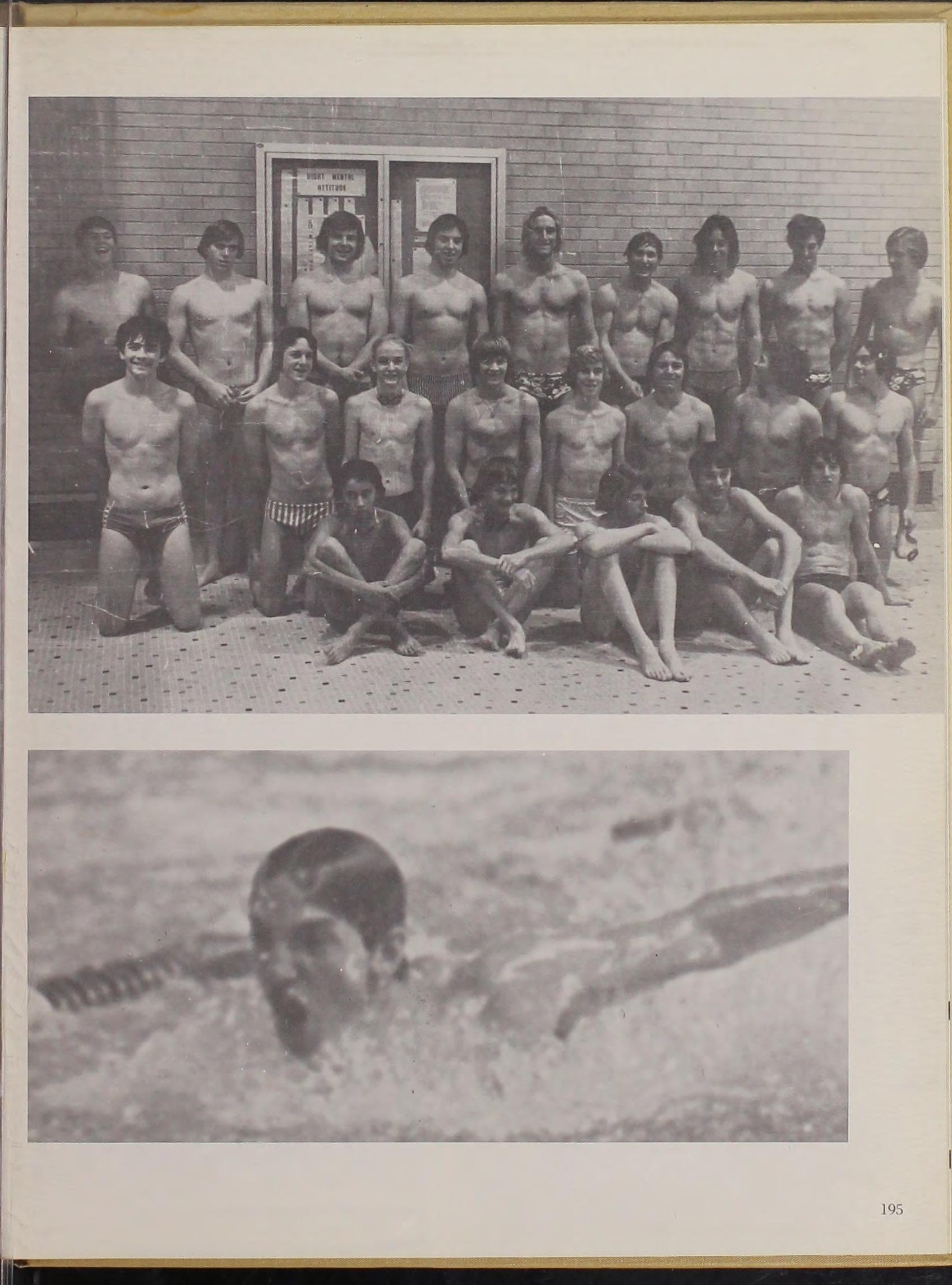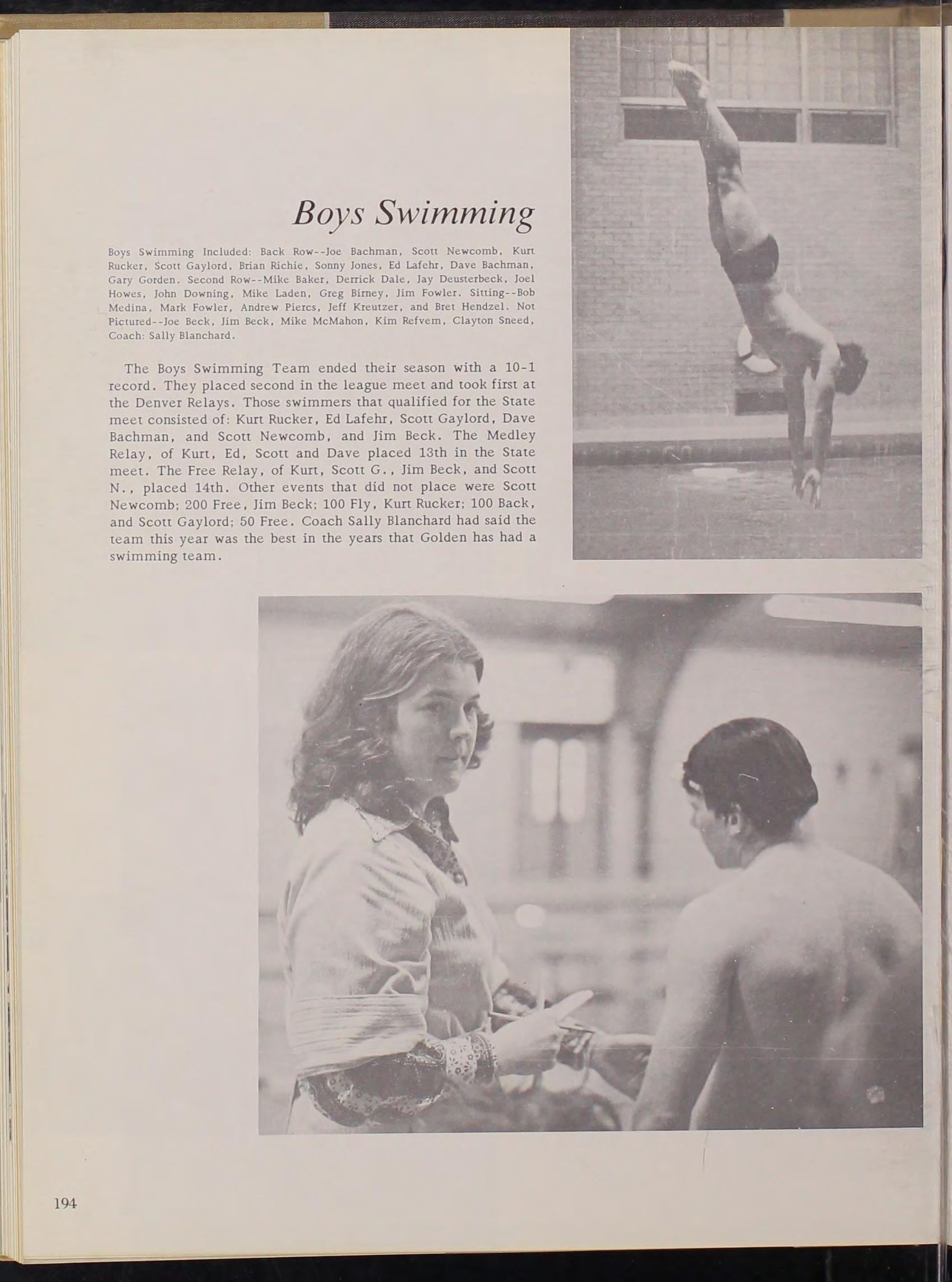 The Boys Swimming Team ended their season with a 10-1 record. They placed second in the league meet and took first at the Denver Relays Those swimmers that qualified for the State meet consisted of. Kurt Rucker , Ed Lafehr , Scott Gaylord , Dave Bachman , and Scott Newcomb , and Jim Beck. The Medley Relay, of Kurt, Ed , Scott and Dave placed 13th in the State meet. The Free Relay , of Kurt , Scott G. , Jim Beck, and Scott N. , placed 14th. Other events that did not place were Scott Newcomb. 200 Free, Jim Beck; 100 Fl y, Kurt Rucker, 100 Back, and Scott Gaylord, 50 Free. Coach Sally Blanchard had said the team this year was the best in the years that Golden has had a swimming team.