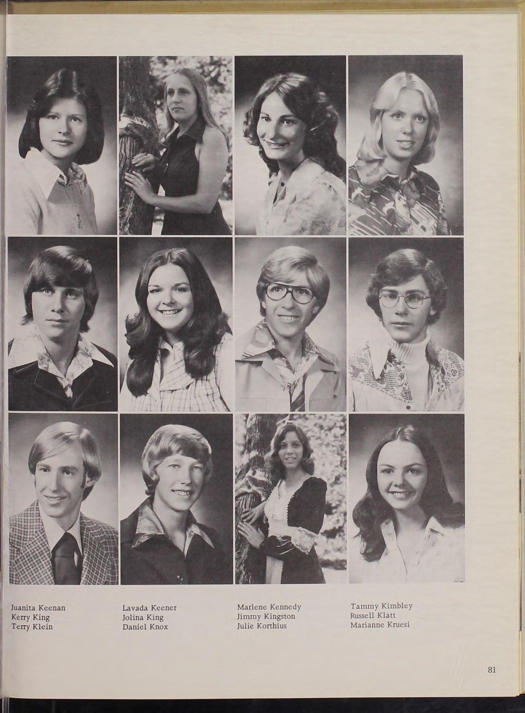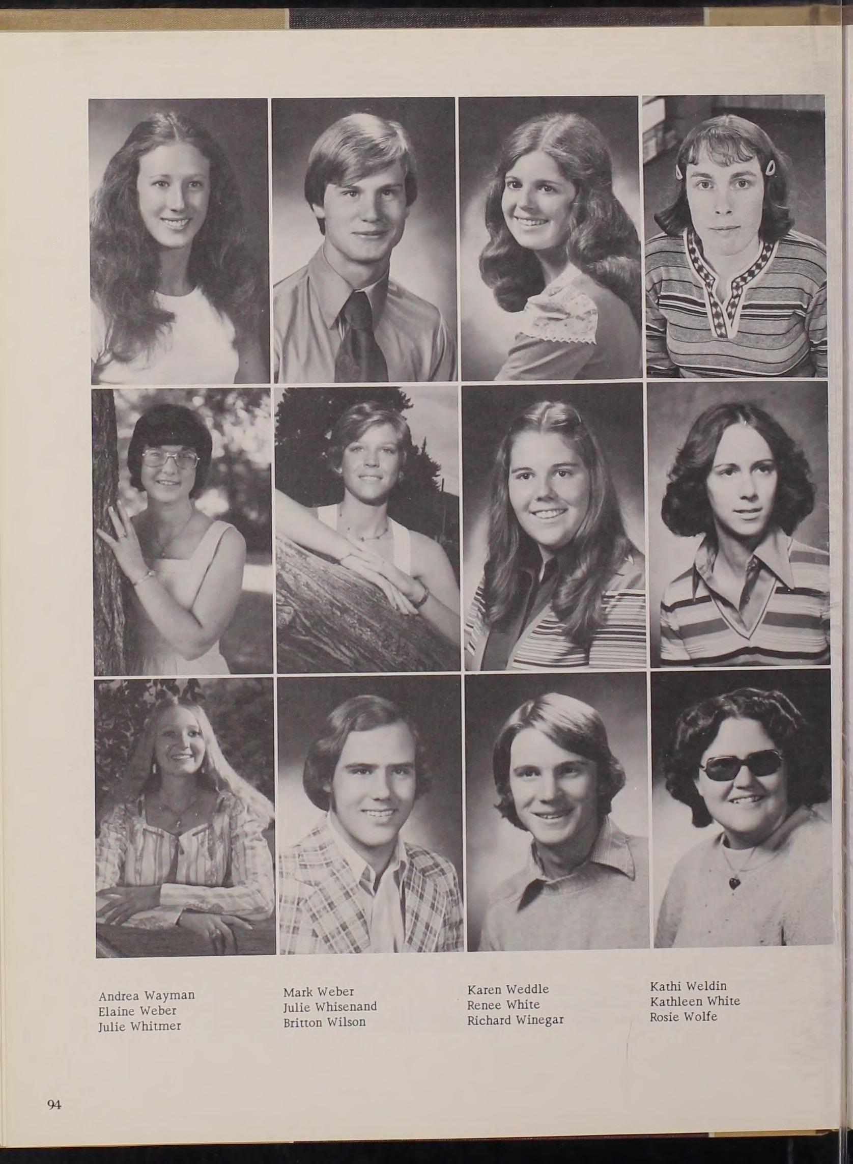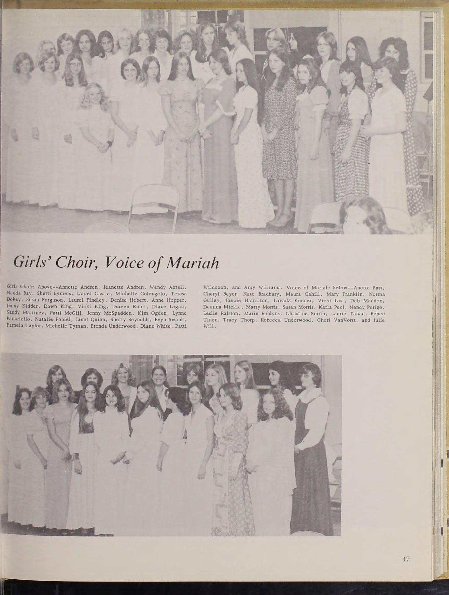 Varsity Volleyball team included Front row-Jenny Scott, Cheryl Coronado, Laurie Welch, Kim Knox, Martha Hutchinson, Cathy Nelson, Karen Press, Deb Durbin, Gay Rittersbacher, Julie