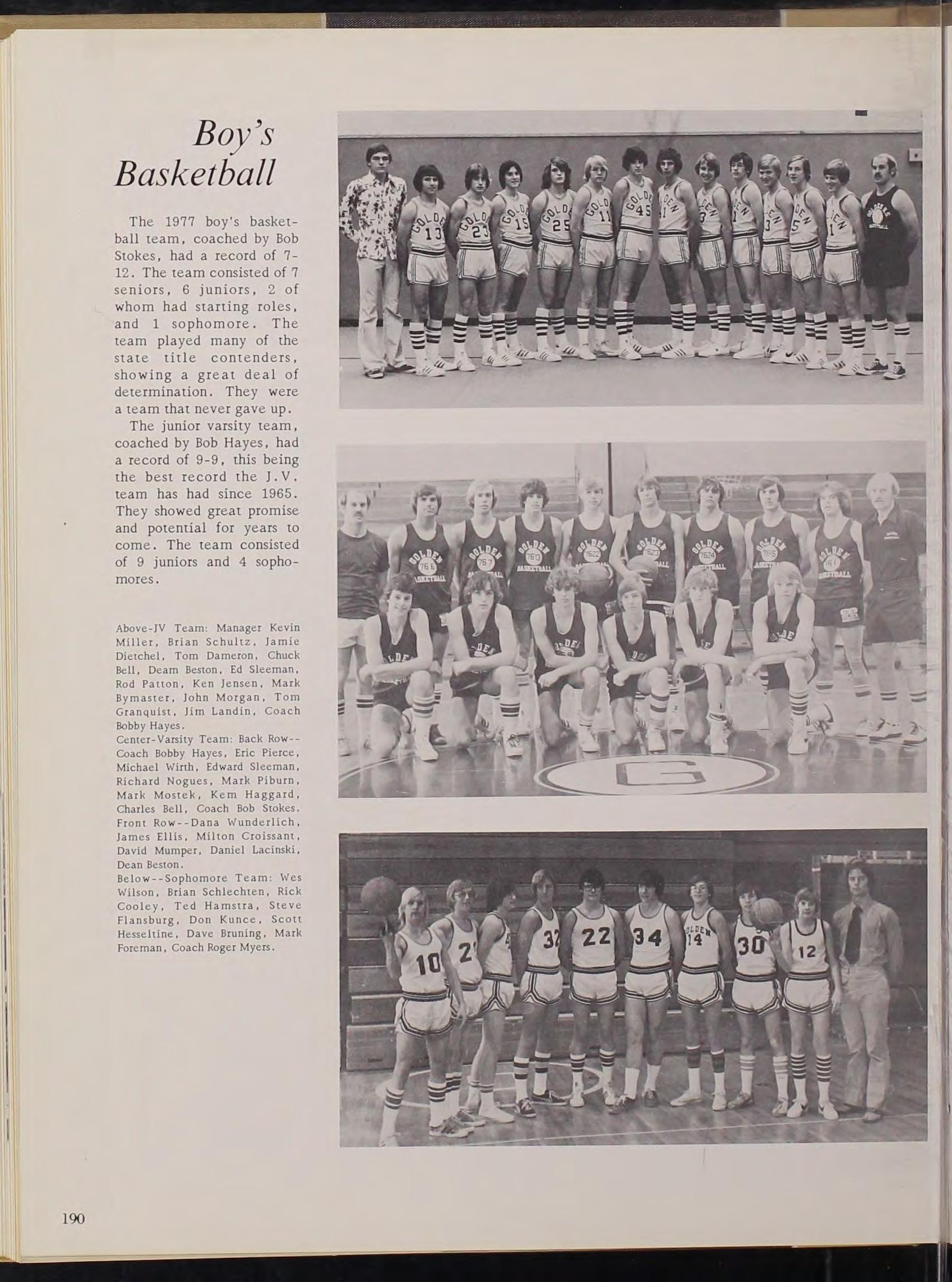 The 1977 boy's basketball team, coached by Bob Stokes, had a record o f 712 The team consisted of 7 seniors , 6 juniors, 2 of wh om had starting r o l es , and 1 so ph omore . Th e team played many of the state title co nt enders , sho wing a grea t deal o f determination. They were a team that never gave up.