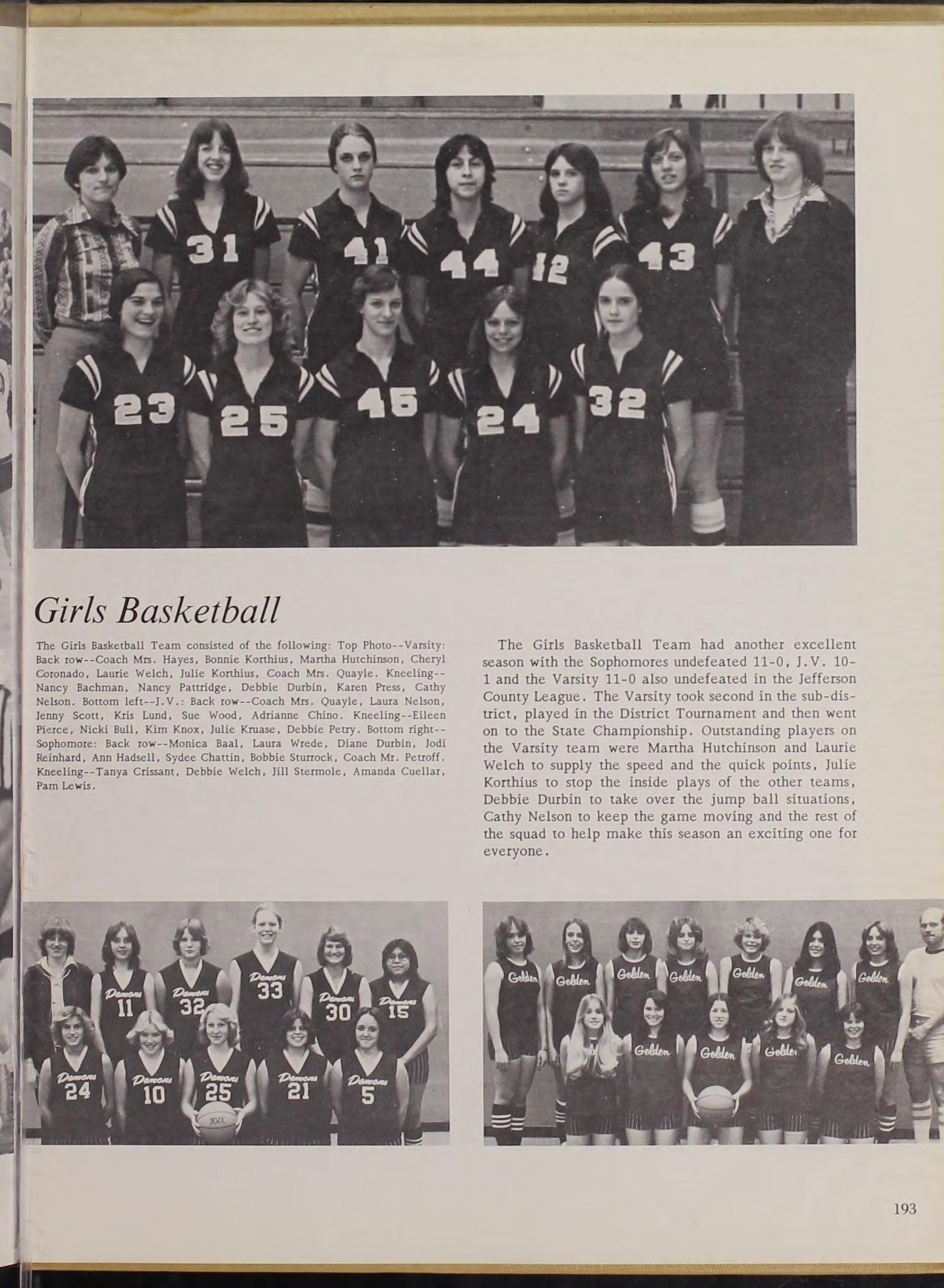 The Guls BasketballTeam consisted of the following: Top Photo--Varsity : Backrow--CoachMrs.Hayes,BonnieKonhlus,Manha Hutchinson, Cheryl Coronado , Laurie Welch, JulieKonh.ius, Coach Mrs.Quayle.Kneeling-NancyBachman,NancyPattridge. Debbie Durbin, KarenPress, Cathy Nelson.Bottomleft--J.V. Back row--Coach Mrs.Quayle,LauraNelson, JennyScott, Kris Lund, Sue Wood, Adrianne Chino. Kneeling--Eileen Pierce,Nicki Bull, KimKnox, Juhe Kruase, Debbie Petry. Bottom right-Sophomore Backrow--MonicaBaal,LauraWrede, Diane Durbin, Jodi Reinhard,Ann Hadsell, Sydee Chattin , Bobbie Stunock , Coach Mr. Peuoff. Kneeling--TanyaCrissant,Debbie Welch, Jill Stermole,Amanda Cuellar, PamLewis.