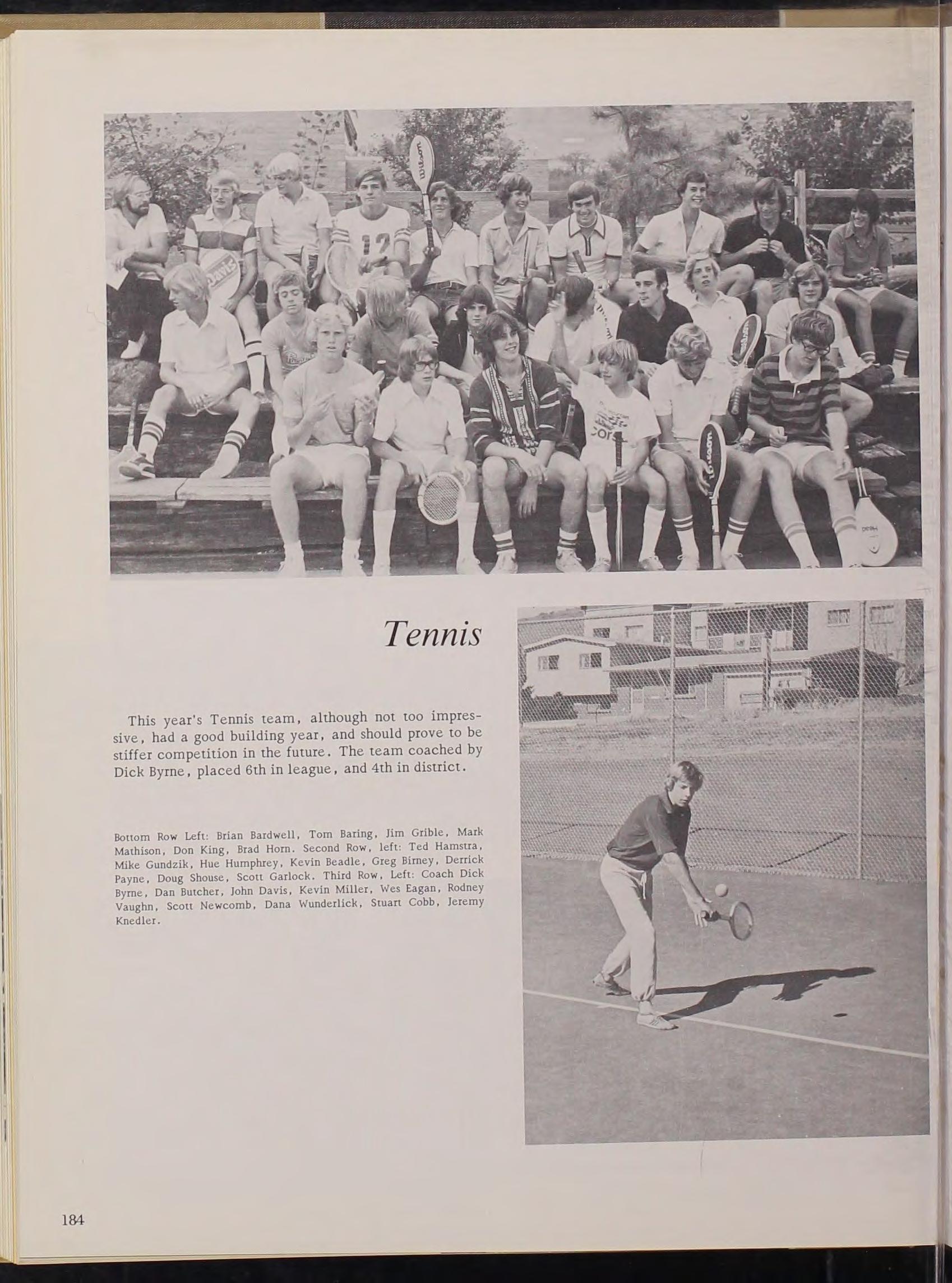 Baseball team included Sitting--Greg Rowe. Rod Baker, Tom Granquist, Dave Mumper, Rich Lockwood, Stuan Cobb, Brian Schulz, Chris Cranky. Kneeling- -Charlie Gaines, Stan Spatz. Dean Beston, Greg Huizenga. \•/ayne Brown, Gary Pierce, Sam Guffey, Terry Bombard, Dana \vunderlich, Eric Pierce. Standing--Coach Thompson. Zach Cashin, Joe Noorlun, Hugh Humphrey, Lonnie Matz, \ves \vilson, Jim Gilbert, Mark Mathison, Kevin Martynuska. Bret Doonan. Bruce Snyder. Coach Homacker. Back row- - Mark Burns Dave Smith, Bill Cullum, Ed Sleeman, Don Thull.