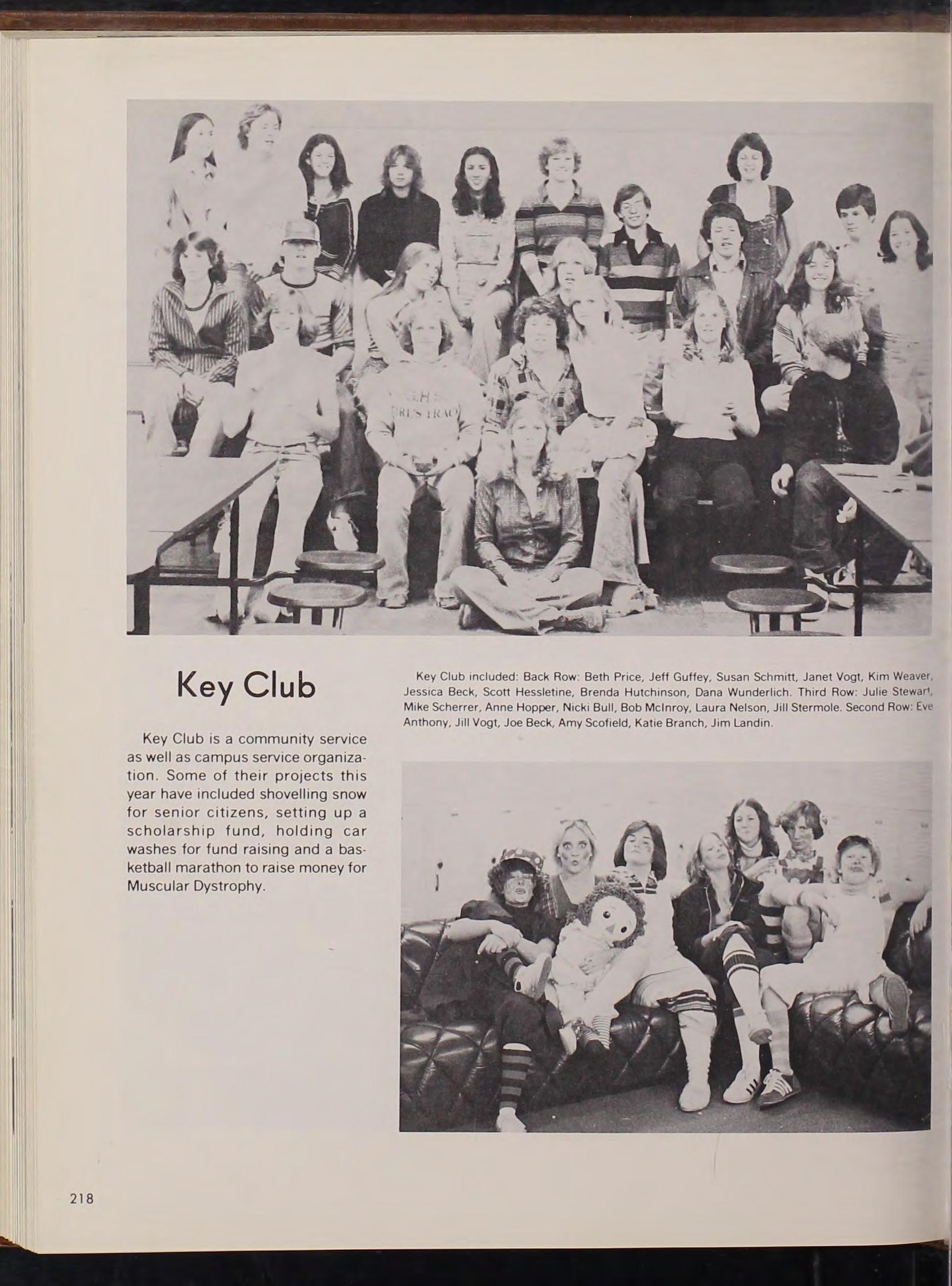 Key Club in c luded Ba ck Row Beth Pn c e, Jeff Guffey, Susan Schmitt, Janet Vogt, Kim Weaver , Jess ic a Beck , Sc ott He sslet,ne, Brenda Hutc hinson, Dana Wunderli ch Third Row Julie Stewart, Mike Sc herrer, Anne Hopper Nicki Bull , Bob Mcinroy, Laura Nelson, Jill Stermole Second Row Eve Anth o ny, Jill Vogt, Joe Bec k, Amy Scofield , Katie Bran ch, Jrm Landin