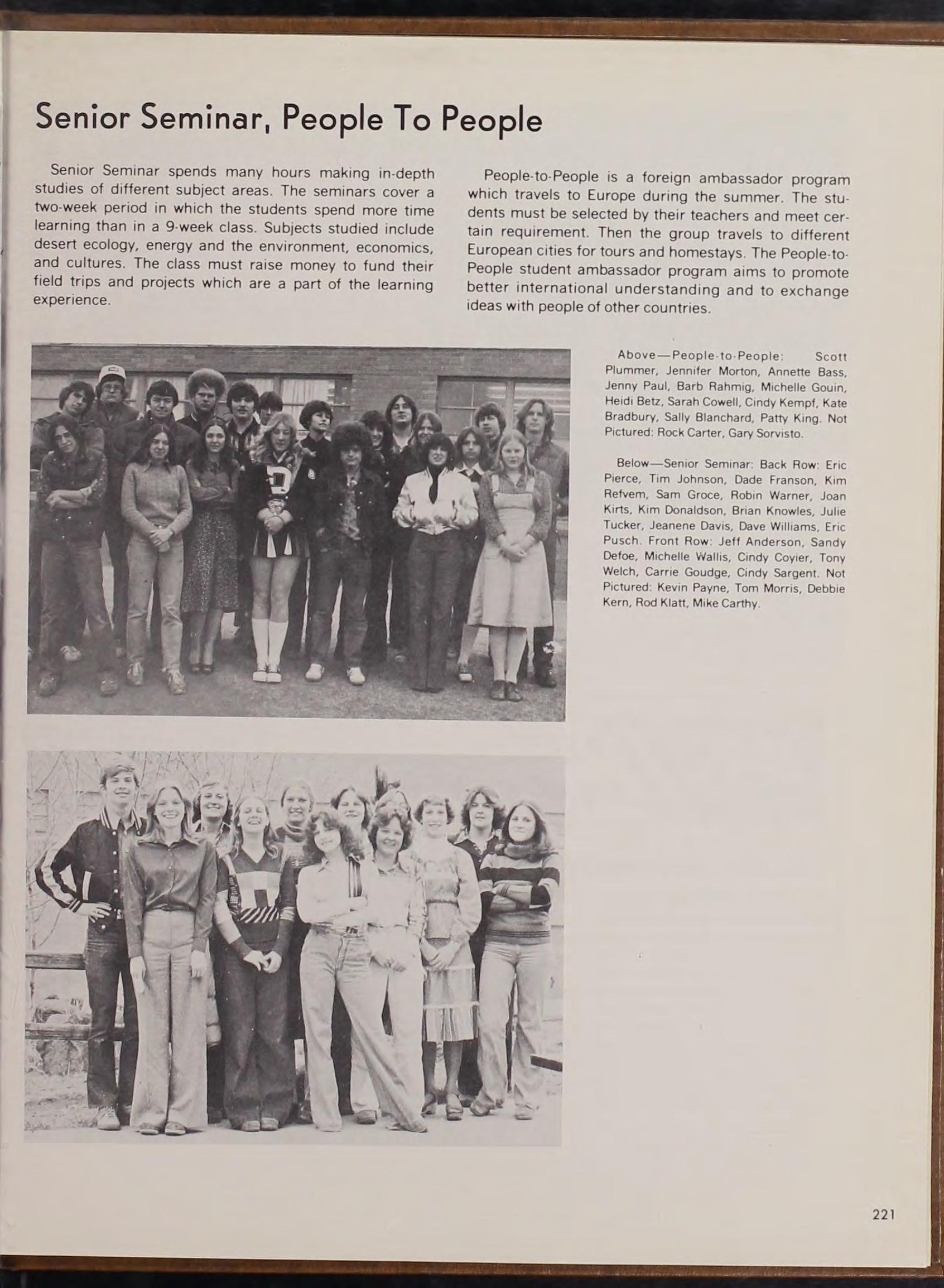Senior Seminar spends many hours making in -depth studies of different subject areas The seminars c over a two -week period 1n whi c h the students s pend more time learning than 1n a 9 -week class . Subje c t s studied include desert ecology, energy and the environment, eco nomi cs , and cultures The class must rai se money t o fund the i r field trips and proJects whi c h are a part o f the learning experien ce