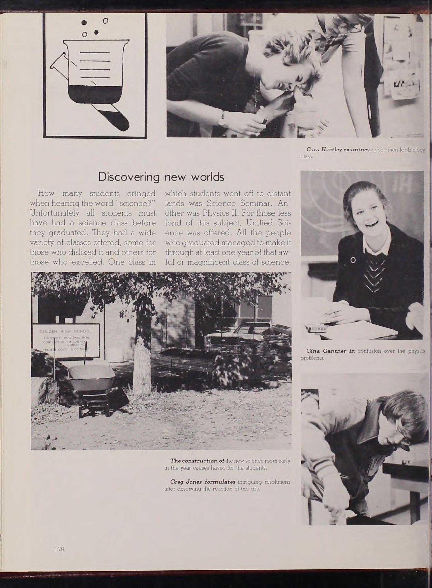 Having looked back through the years, Golden High School has undergone many changes. It might be hard to imagine, but what was once the student lounge 25 years ago has since become the counseling center. The chemistry room has been remodeled along with many other rooms. Changes have continued even into '82'. The first bit of ground was broken to accomodate the new science room.