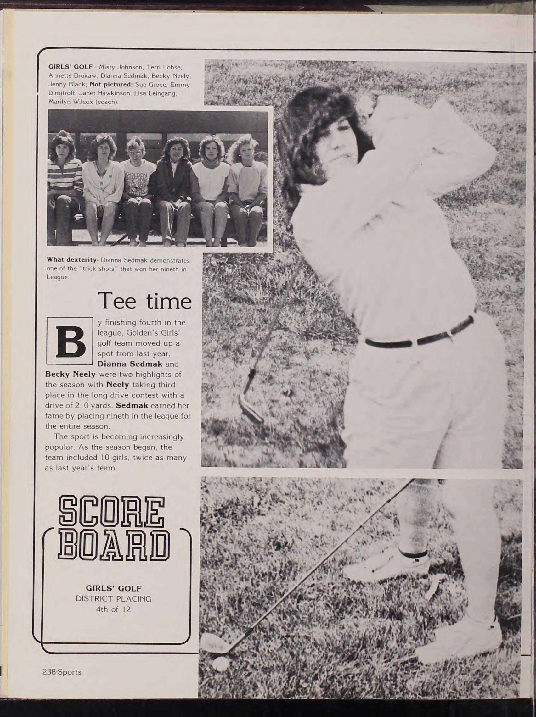 Dianna Sedmak and Be c ky Neely were two highlights of the season with Neely taking third place in the l ong drive contest with a drive of 210 yards Sedmak earned her fame b y placing nineth in the league for the entire season