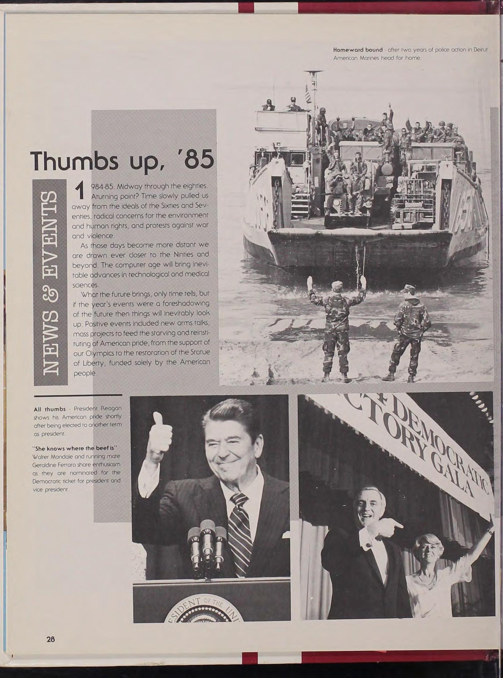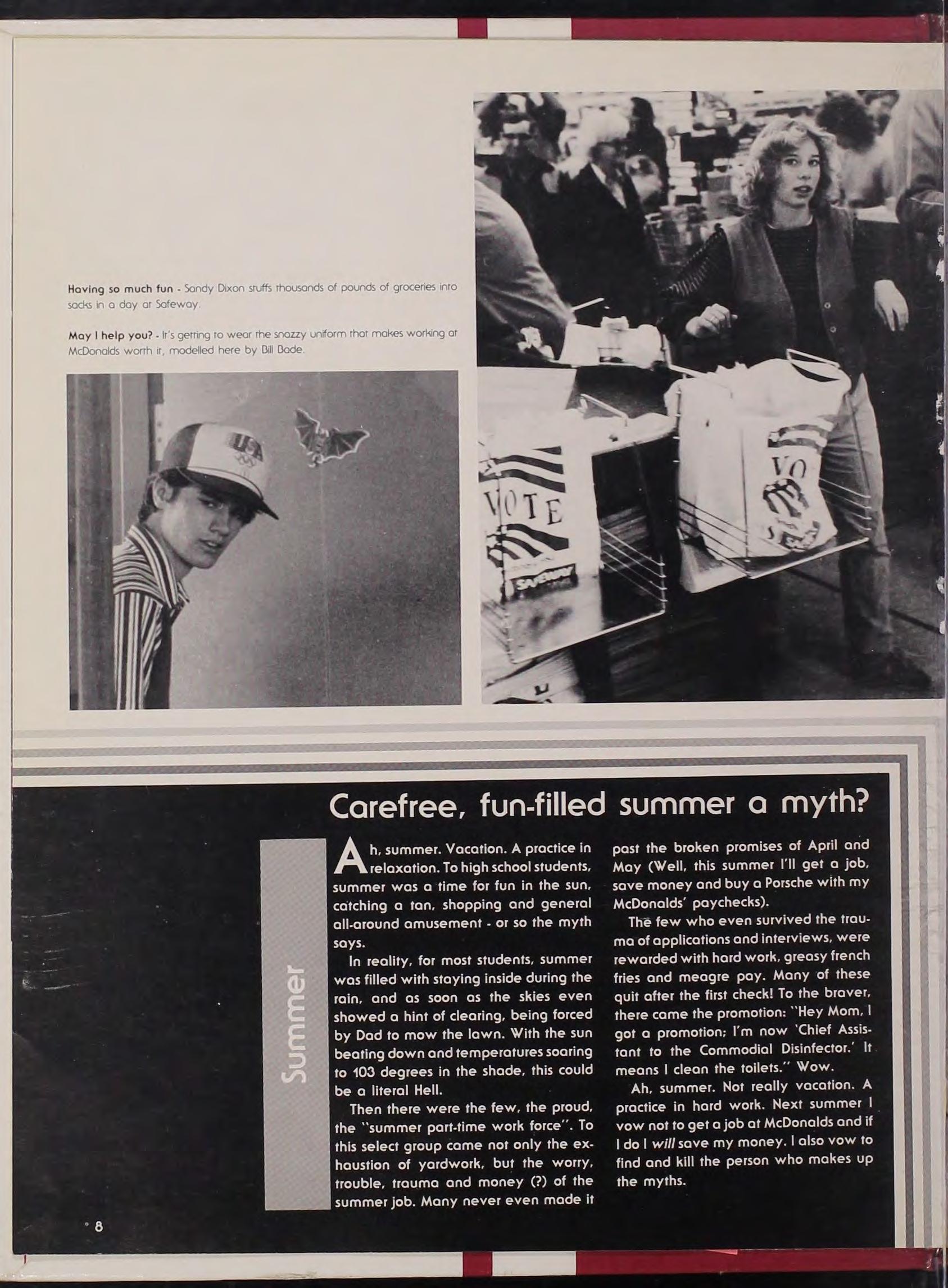 Layers were definitely "in" and rhe colors were no exceprion Turquotse and fush10 wenr rogerher as well os peach and gray, red and block and the flourescenr oranges, greens and pinks For everyone concerned about fashion loose fitting dorh1ng was a musr Speol~ing of fashion, popular names thor appeared 1n swearers, r-sh1rrs, and jeans were Esprit , Hunter' s Run , Ralph Lauren , Ocean Pacific, and Le vi s Army forigues were worn by those students that wonted that "adventuresome" look and swears were available for those who wonted ro be sporry and casual