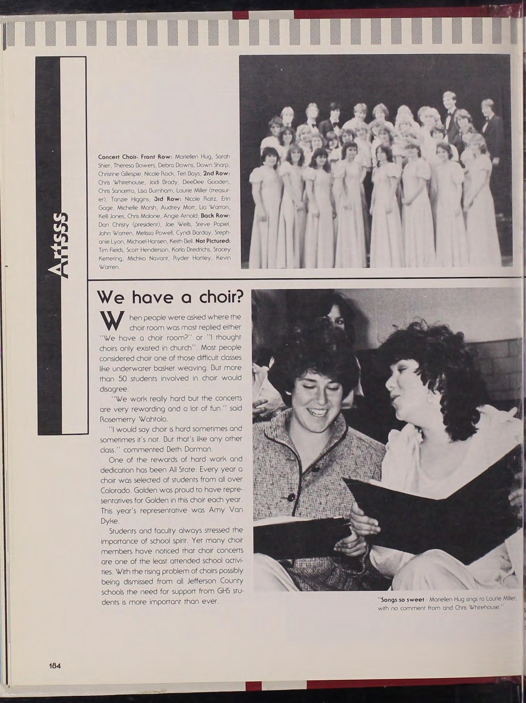 102 150 Gage Enn 102 184 Gage Leslie 77 Gage l\ick 68 Goins. Charlie 131 Gallagher Jennrfer 113 Gamble Wayne 102 182 Gantner Greg 84, 105, 149 , 151. 169 Garrod Leslie 84 Garvin Koren 55 Goschler Scorr 84 Gosvodo Kevin 102 131 , 181 Gercken Henry 117 Germon Club 172 Gershrenson Joe 84 , 166, 17J Gerw1ng Momno 102 173 Gerrer Oobby 102 150 Getter l\enee 54 77, 166, 174 Gerrer Srephen 102 Gibson. Cook JO Gidley Lorry 84 135 153 G1dlund Everett 102 181 Gill Kim 102 G1llesp1e Chris 84 184 185 Gilmore Kim 55 192 193 Girls Ooskerboll , JV 158 Girls' OoSKerboll, Varsity 156 157 Girls ' Gymnastics , 142 14J Girls · Sw1mm1ng 1J8 139 Gleed Mll~e 102 Glenn Jeff 13 84 166, 171 181 Goldbeck Chns 102 186 Goldbod~ Korhy 5 , 55 , 171 , 180, 186 204 Golgorr , l\ondy 84 Goode Voundo 117 Gooden DeeDee 102 184 194 Goodmon Denise 46 55 , 186 187 204 Goodwin Downonn 102 Goodwin Dennis 55 Goodwin Gayle 102, 199 Gorden Gino 84 85 185 191 , 223-\... -.. :
