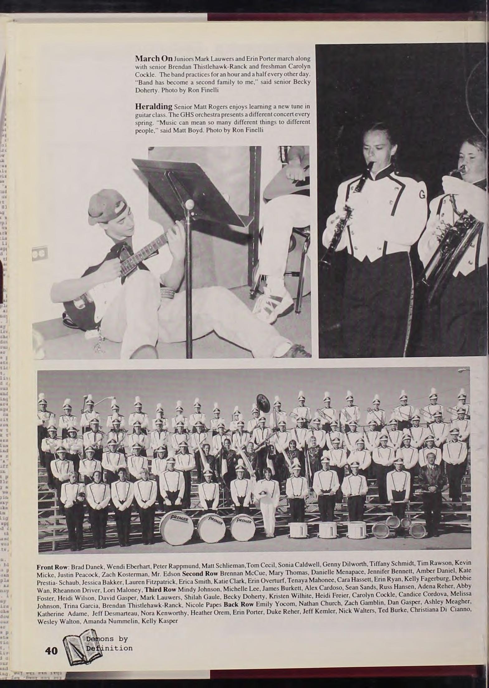Eve r y s tud e nt th a t r oa m s t h e h a lls a t G H S h as t o e ndu re so m e kind o f m a th co ur se. F r o m A.P. Ca l c ul us to Co r e classes , th e s p ec trum is broad T eac h e r s like M s Eileen Cook h e lp to p ass o n thi s kn ow le d ge t o th e s tud e nt s a n d m ay t eac h m any leve l s of m a th in o n e se m es t e r . New addi ti o n s t o the m a th de p a rtm e nt in clu de t oo ls lik e th e Ca l cul a t o r Based La b o r a tory, an d a m o ti o n d e tec tin g ca lc ul a t o r th a t h e lp s s tud e nts with ve loc i ty and o the r r e la t e d pro ble m s . So ph omo r e Joshua Rood sa id, " Th e compute r s r ea lly h elp m e in m a th, mine eve n h as ga m es on it ." And y Th o m as a nd Juli a Sc hmidt