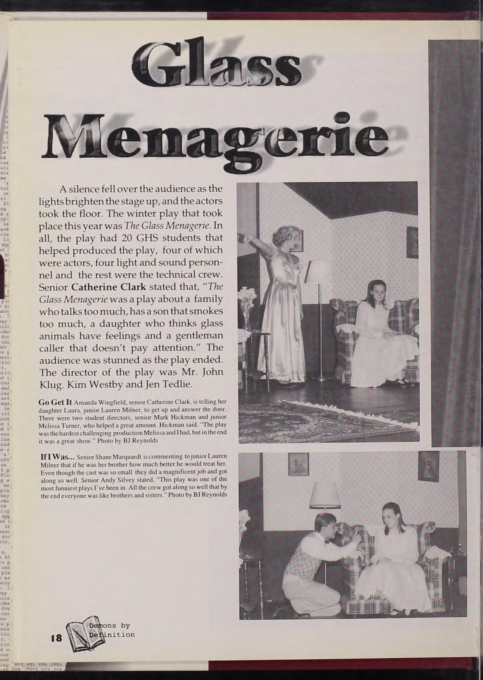 Three years ago I decided to join Yearbook because it sou nd e d fun and excit ing. What I didn't know was that around deadlines, Matt and Mr. Finelli are unable to be fun a nd excit ing. Overall, yearbook ha s brought a l ot of interesting people into my life. Without these people my life would be empty . Melissa, without you I wouldn't have anyo ne to tell me what it is like to have the computer screen reaching out towards me. Thanks for a ll the advice and laugh s you have given me in the past three years. Katy Raty, you have been a really good friend. You are always ready to laugh and always read y to li s ten. Keep running those red lights to get to the gay nudie bars and you will be very successful in life!! Nikolas Peter, without yo u in Yearbook I would h ave gotten my work done on time, barely laughed , and killed at least one person. You are one of a kind Nik, and your butt is too much for me to handle. Matthew, when our CCB papers were due you kept me from having a complete nervous breakdown. I a lwa ys felt lik e I needed to thank you in a big way, but now I realize giving you LOTS of moonshine and hillbilly jokes is good enough. Thanks for the late night cartoons and putting up with me, Becca, TP, and s hoe polish. That is all I have to say about you as a person, but I could go on forever about your butt. Matt Frost, I hope you never pity me. Remember, before you go to the grocery store yo u have to FIX to go!! To the all the Matt groupies, when you need moon s hine I will be at the end of a co untry , dirt road in a s hed somewhere in North Carolina. Becca, thanks for the corruption. My Senoi riti s would have set in much later if it hadn't been for you. Hedy and Anna, you guys were my first friends in Co lorado and I wouldn't have made it this far without you two. For al l the people I left out, deal with it. The only thing I have left to say is