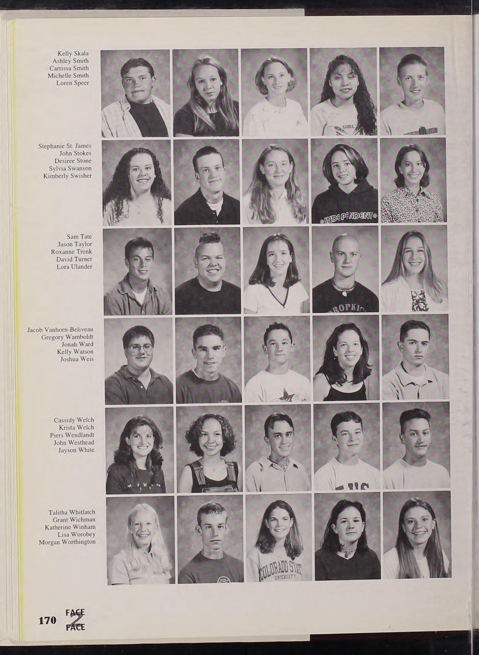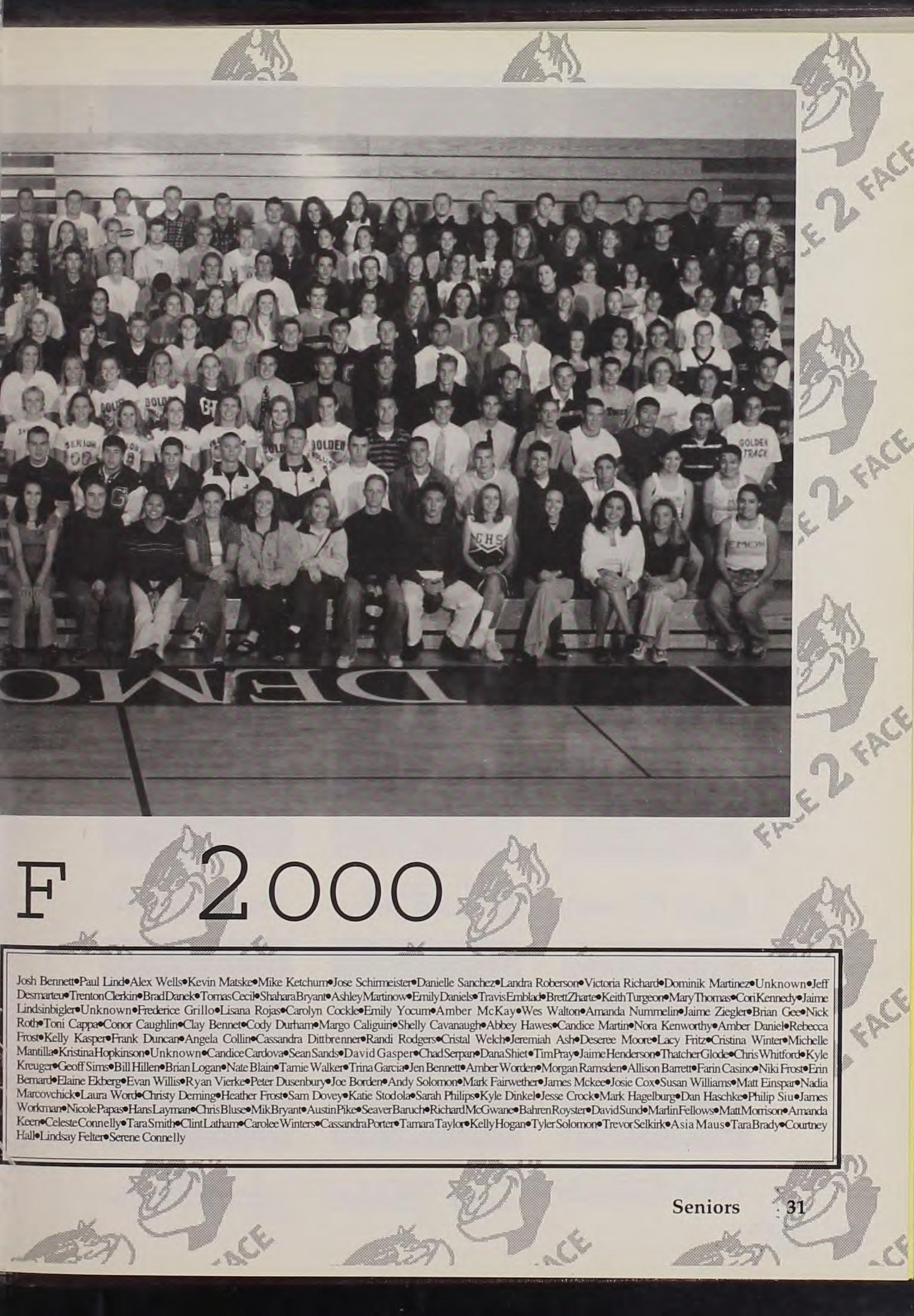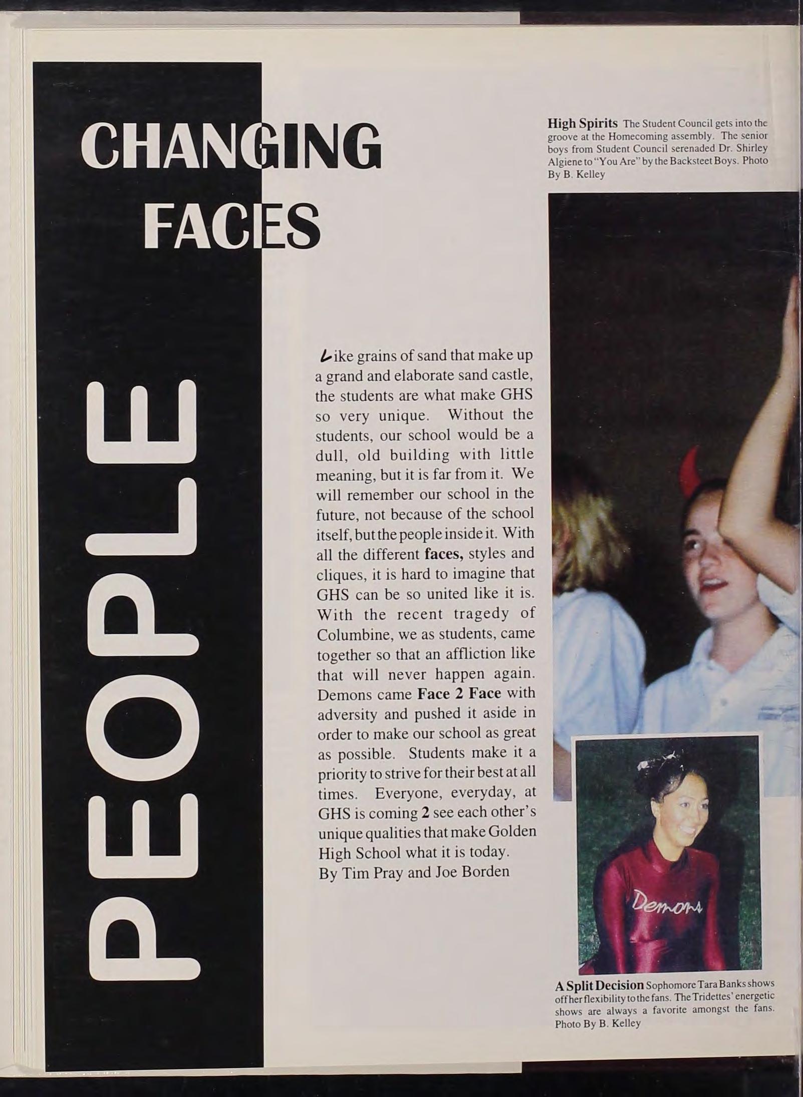 fa ce 2 Face was written with the intentions of making hi s tory. Since thi s book essentially represe nt s the end of an era, a lot of strain and effort was put forth to makeFace2Face the bes t it could po ss ibly be For the outsider, thi s yearbook is just a fancy book containing unknown faces and facts. For us Demon s, it 1s a lot more It is a collection of memorie s and good time s bound into a memorandum of hi s tory. Being the o ldest sc hool in Co l orado, our tradition is richer than any ot h er. It i s apparent in every thin g we do From sports to academics, our sc h oo l s pirit and pride shine s through the gloomiest time s. A s we face a new century and a new millennium, we a lso face many changes in our live s. From the fre s hman , s first s tep s as a " terrible teen ,, to the se niors' fir s t stri des into adulthood , the se monumental footprint s of life will be imprinted in our minds forever. Thi s book wa s made to help each and every one of you be able to look back a nd remem ber your own ex peri e nces as vividly a s pos sible We h ope you enjoy the la s t Golden yearbook of the 20th cen tury.
