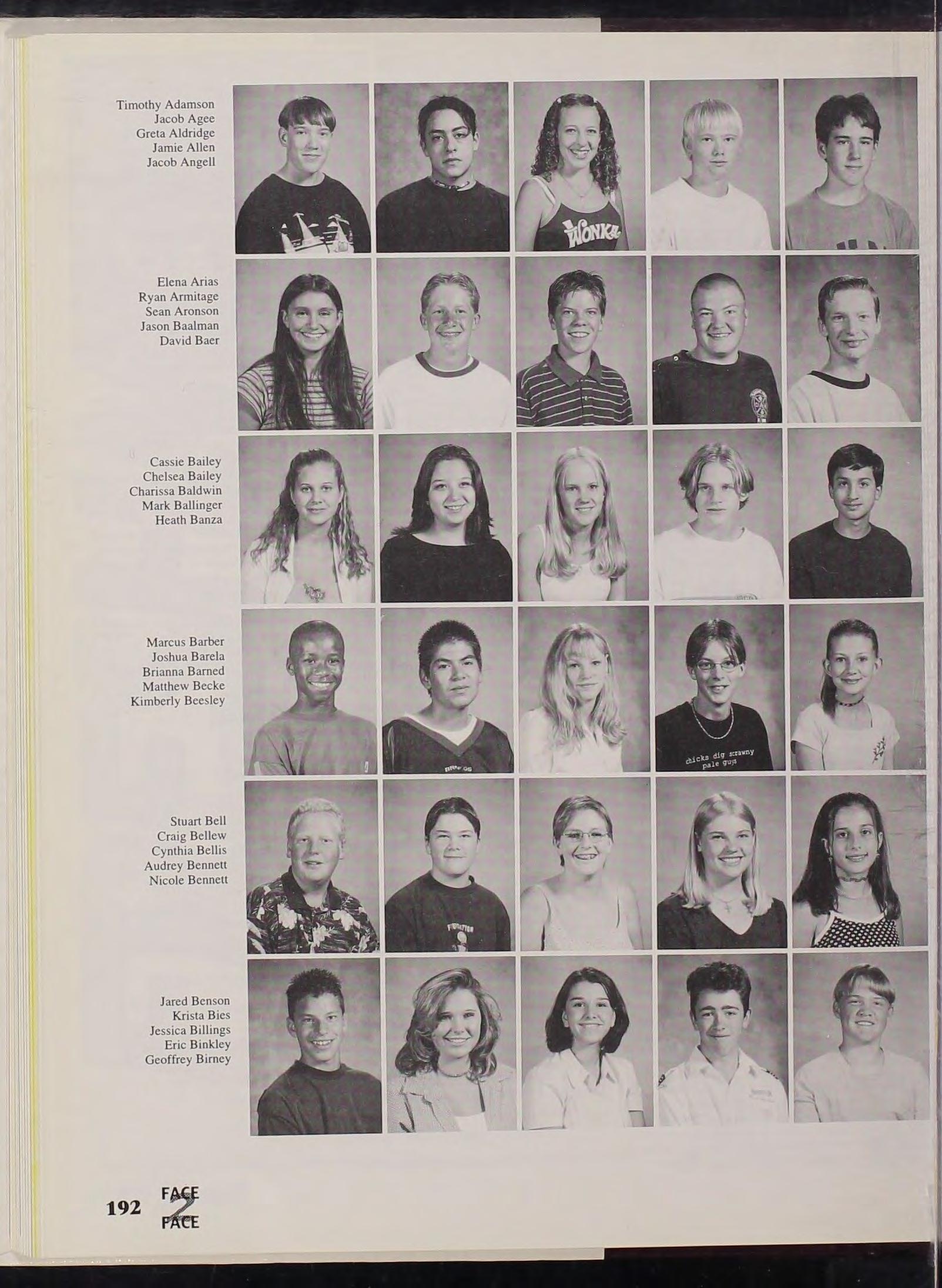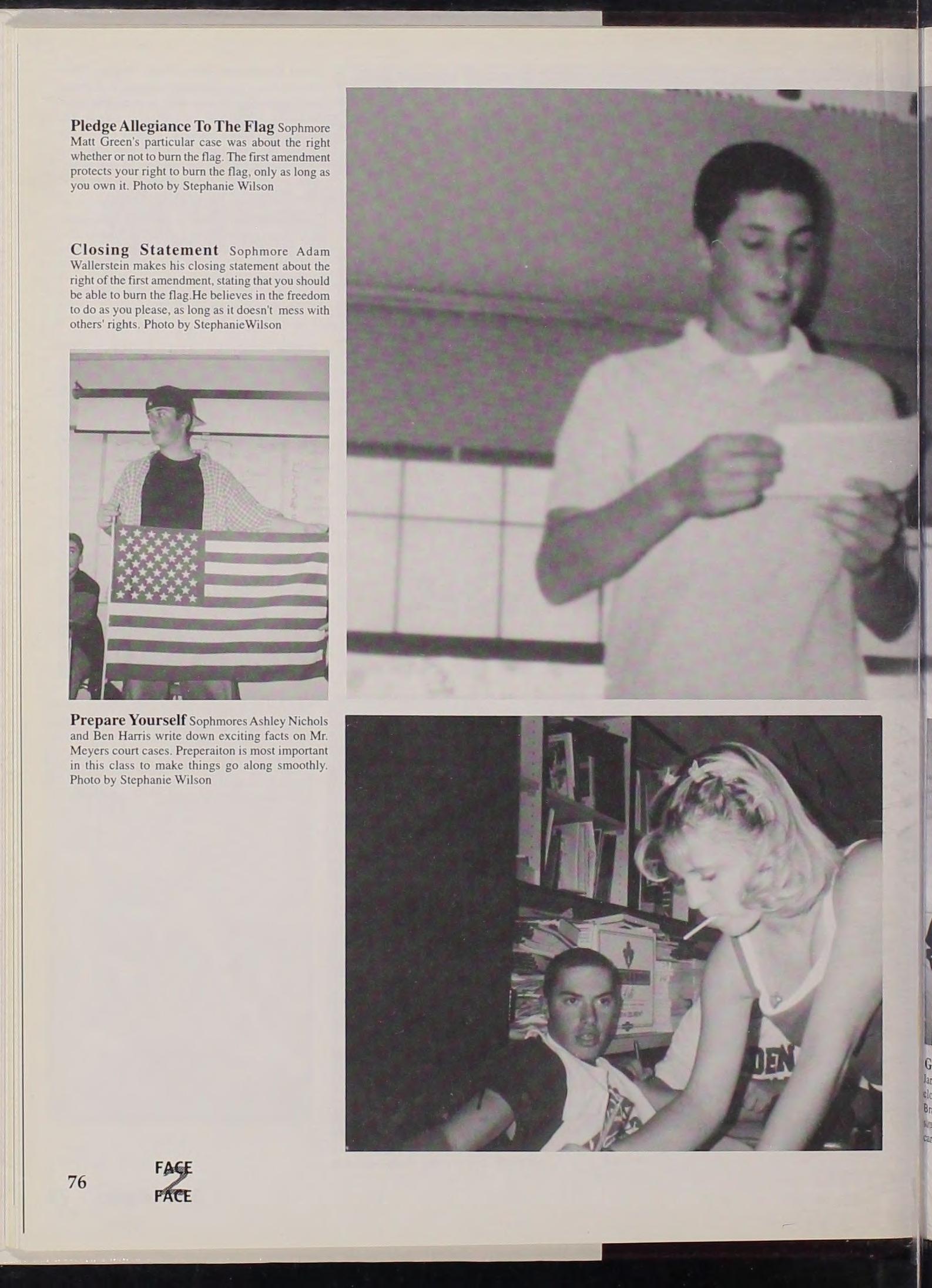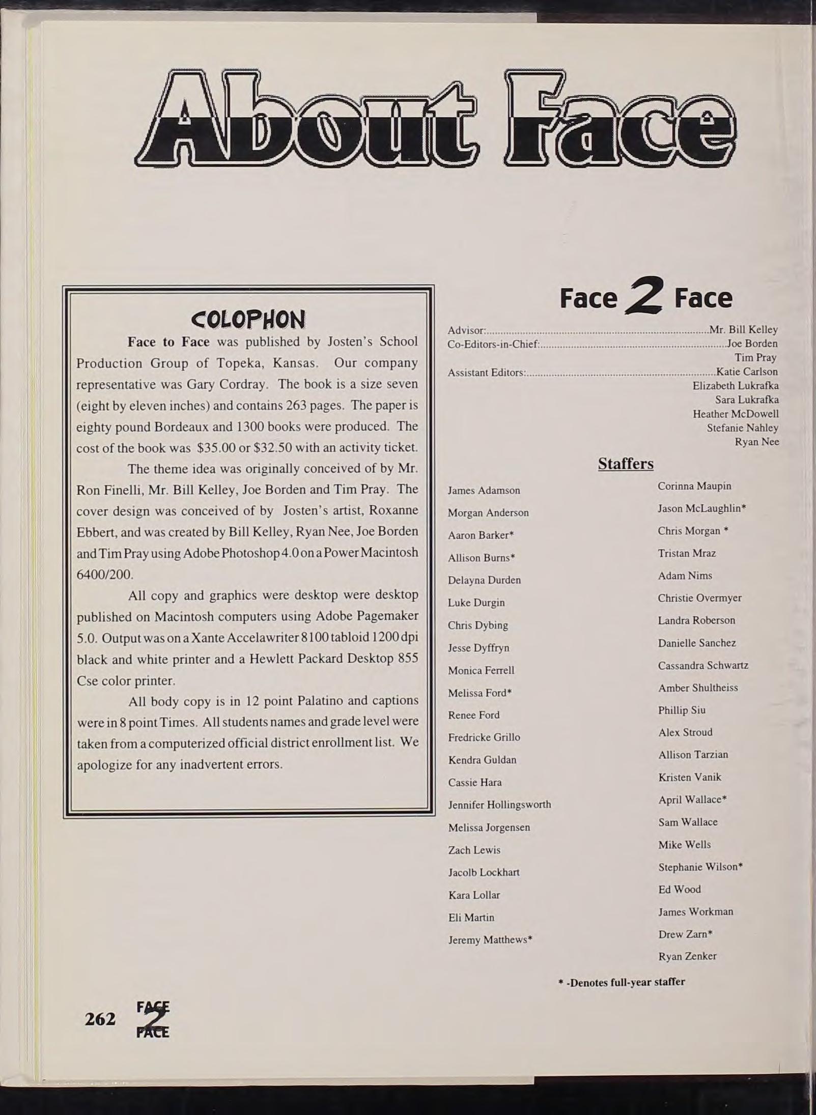 Face to Face was publi shed by Jo sten's School Produ c tion Group of Topeka , Kan sas . Our co mpany repre sentative was Gary Cordray The book is a size seven (eight by eleven inche s) and contain s 263 pages. The paper is eighty pound B ordeaux and 1300 books were produced . The cost of the book was $35 00 or $32.50 with an activity ti cke t.