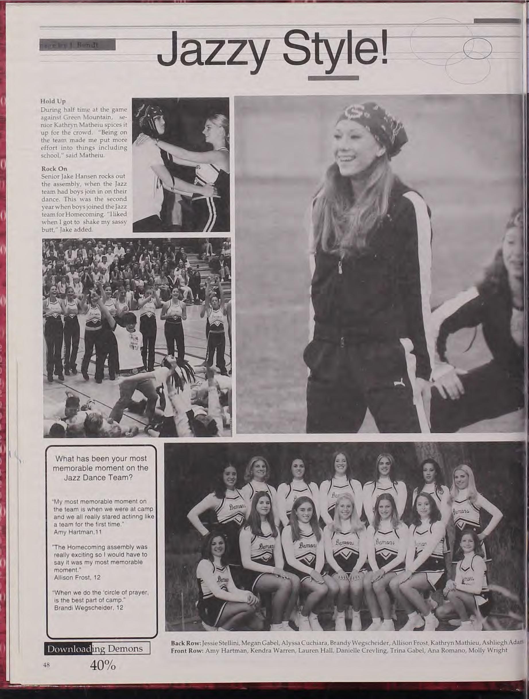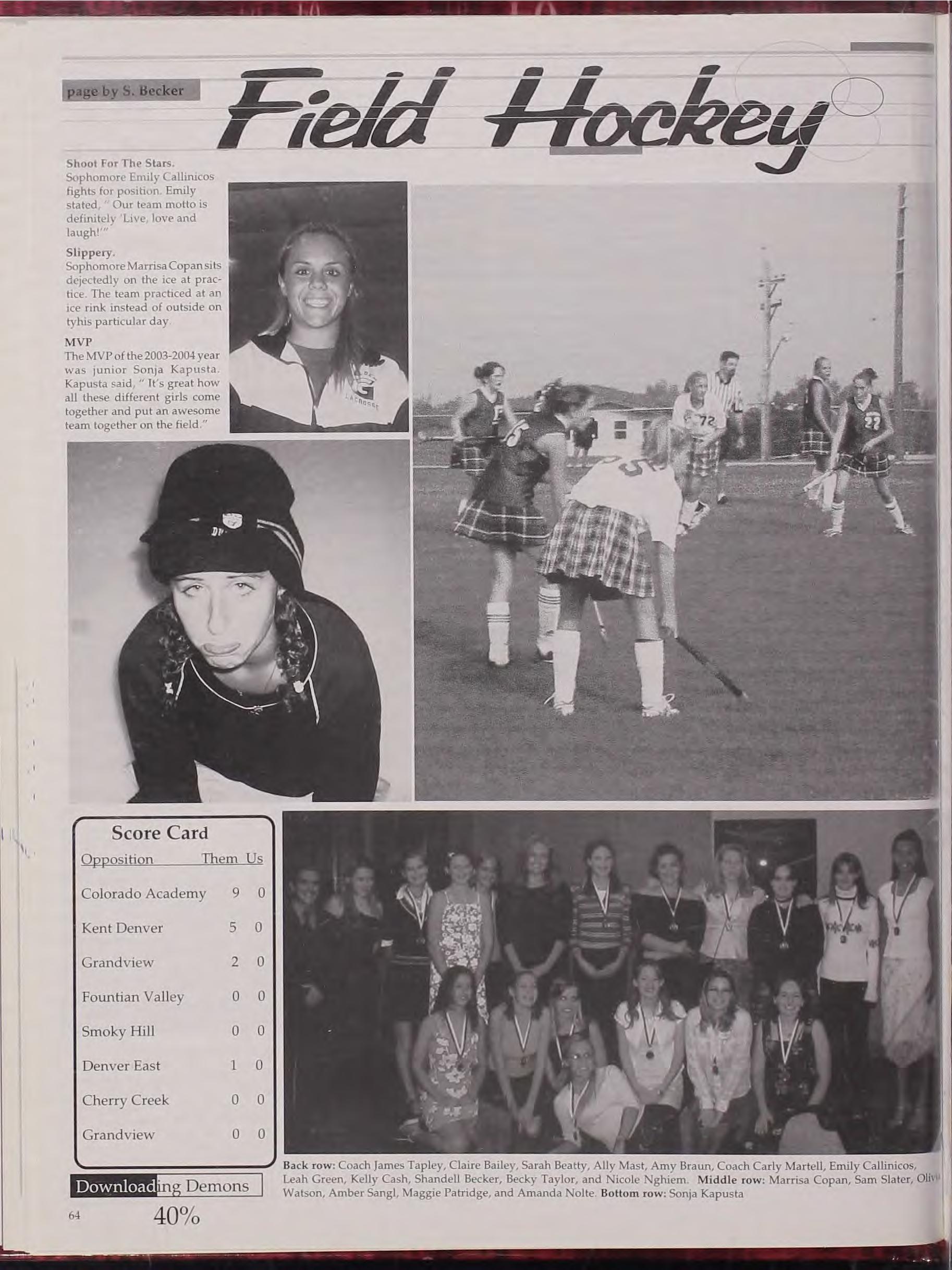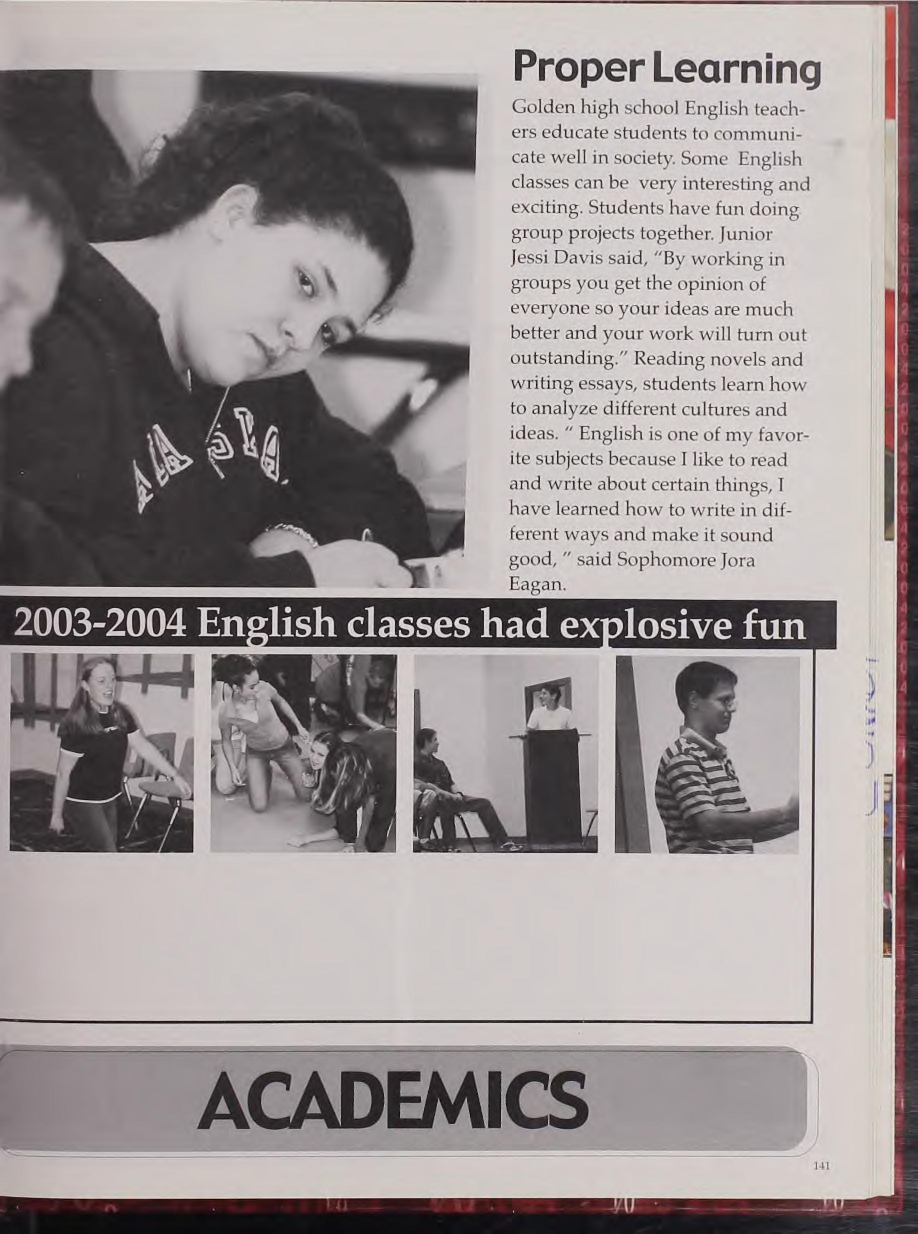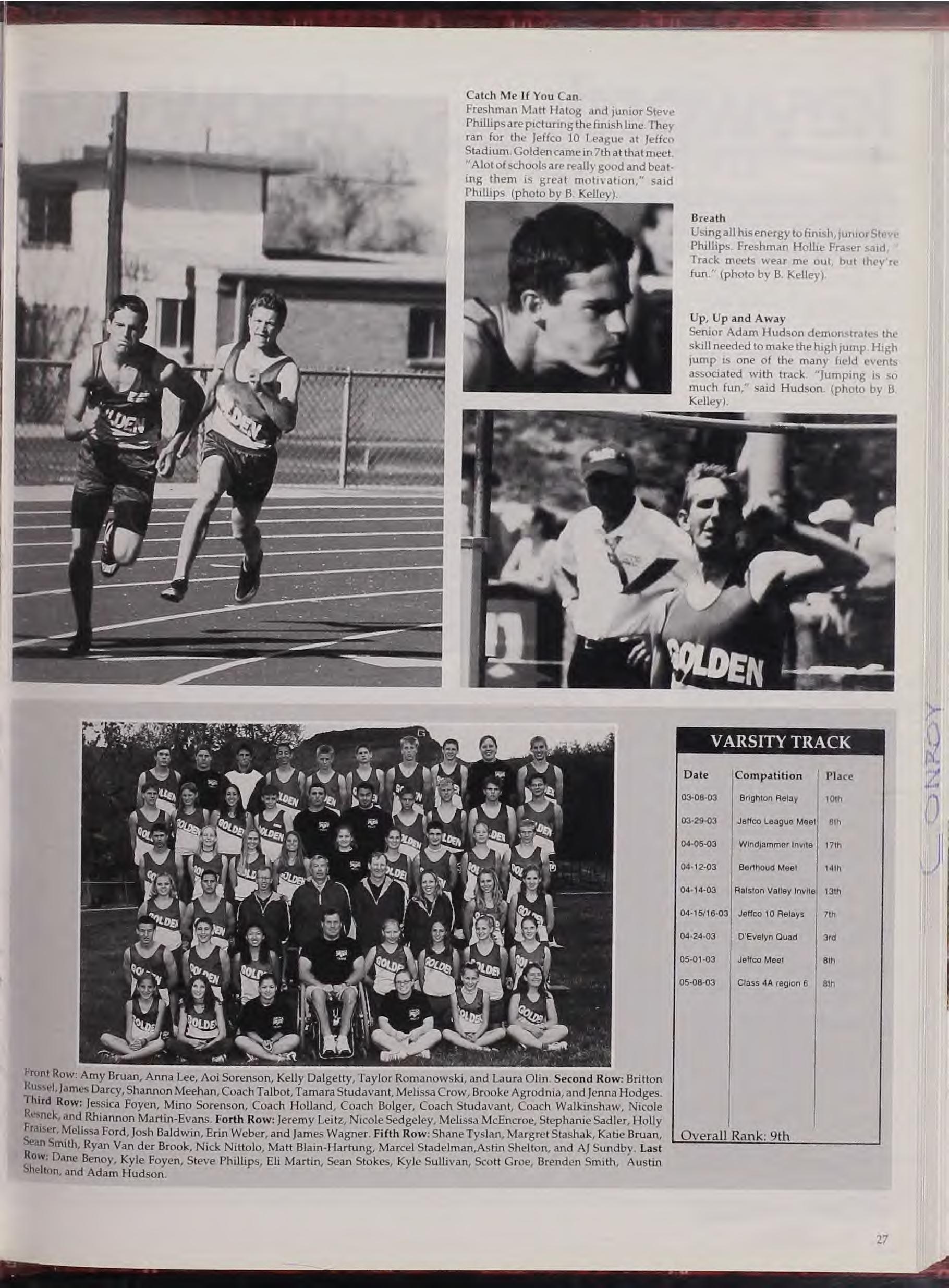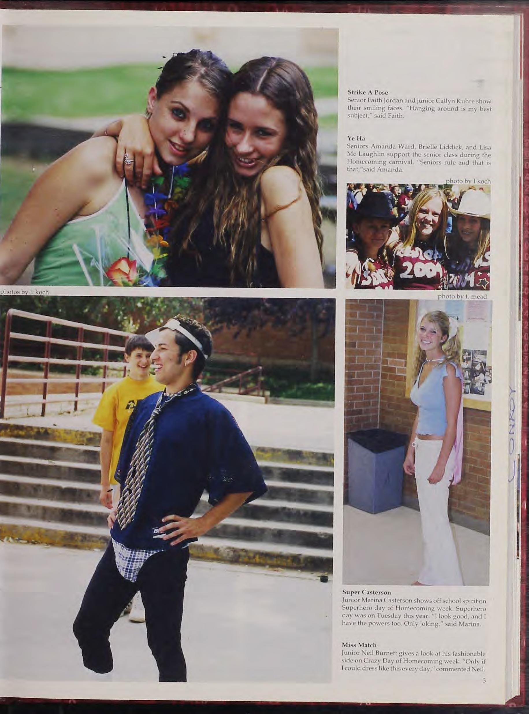 Not very often do you see girls talking and thro\ving aro11nd other girls, but the powderpuff game at this Homecoming carnival ,vas a great place to see it. While some people s ee povvderpuff as just another fun sport to play, otl1ers perfer to watch. "Powderpuff is a great opportunity for females to play football," said senior Diana Sendgraff. Po,vderpuff has al,vay s drawn a big crowd of guys. "I like to watch all the girls rip on each other," said sophomore David Gustafson. The senior of 2004 beat the freshmen and then for a second victory beat the sophomores. The sophomores came in second, the freshmen came in third, and last but not least the juniors came u1 fourth. 0 The Homecoming carnival was a really big success, and spending the time we did setting up ,vas \VOrth all the hard \.Vork ,'' said Student Council member Stephanie Liddick. Before the Homecoming Game, Golden High School l1ad its ann11al pa• rade, which took place in downto"'n Golden. Each cla ss h a d their own float in the parade, ,vhich they rode do\>vn to Brook s Field \A/here the football game took place. Also participating in the Homecoming Parade were the Jeffco High School Rodeo Team, the Drama Club, and the Golden High Dancing Den1on s, to name a few.